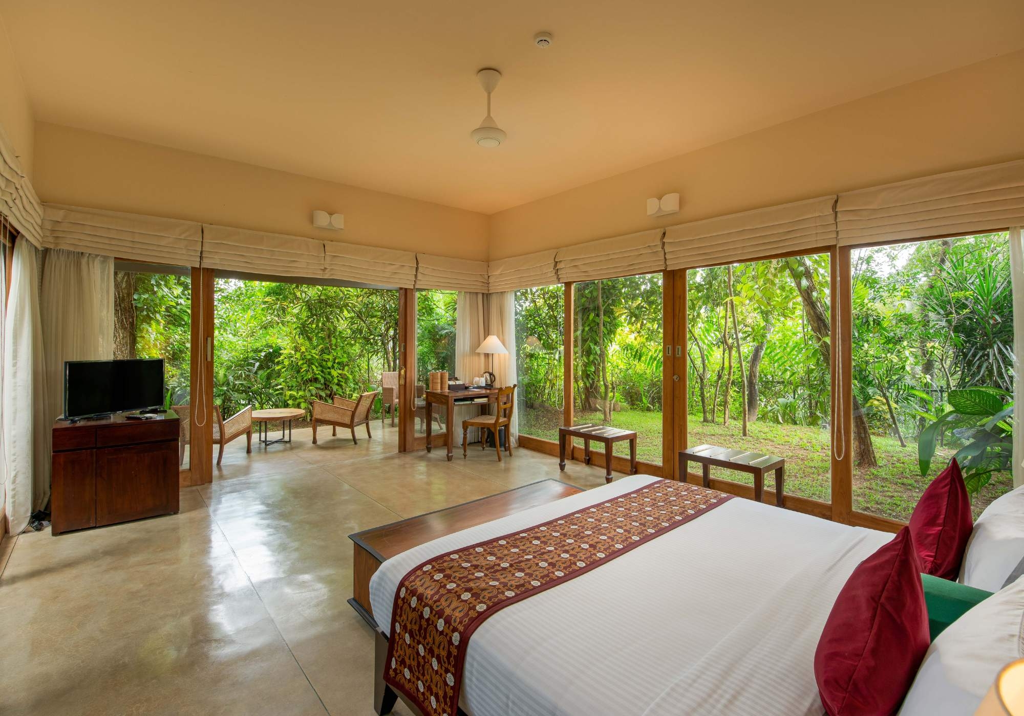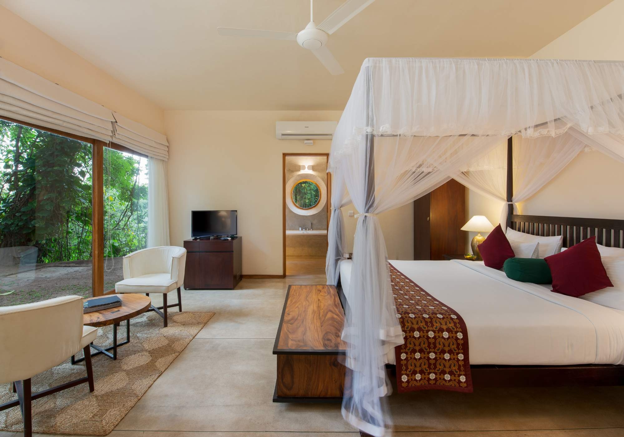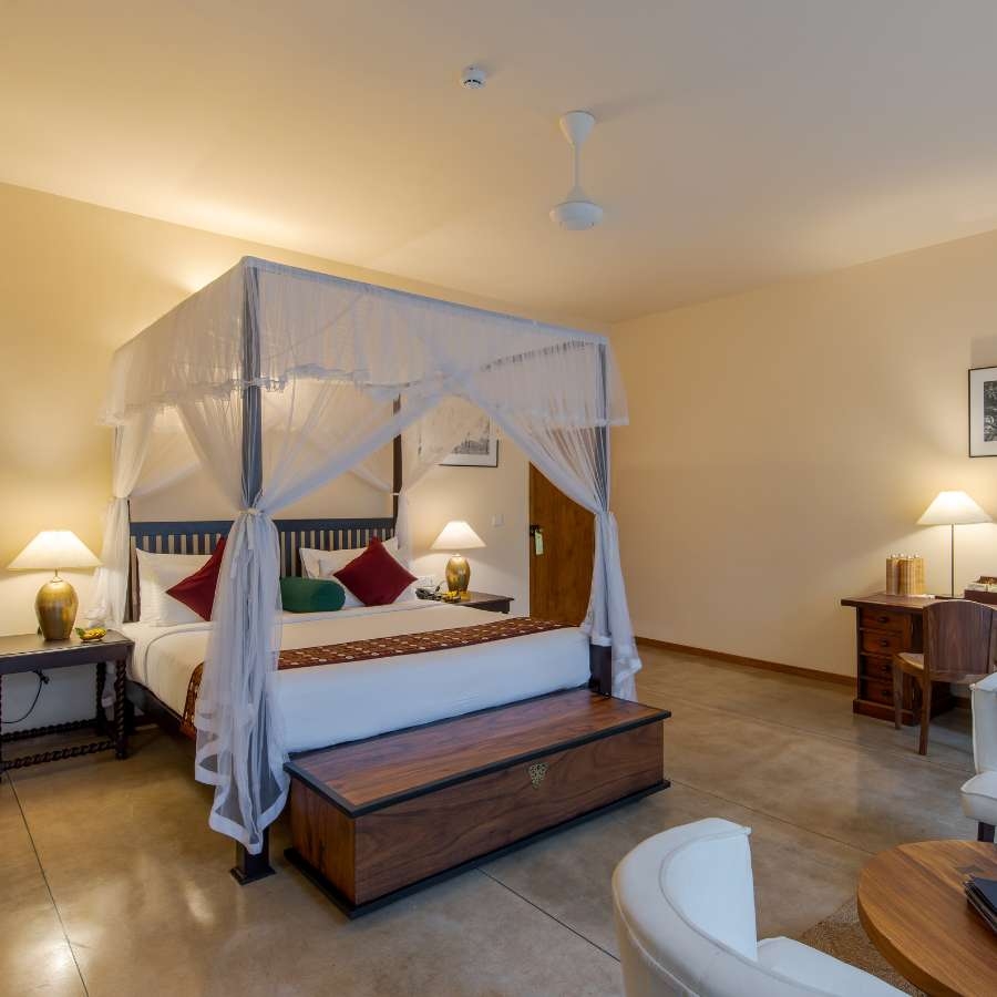 The decor here harnesses traditional Sri Lankan design with open verandahs, teak wood interiors and antique furnishings. All the guest rooms at Kings Pavilion are spacious and the large windows, some floor to ceiling and some wrapping two entire walls, flood the rooms with light. Furnishings are calming neutrals with lots of exposed wood bringing a lovely warmth to the space.
