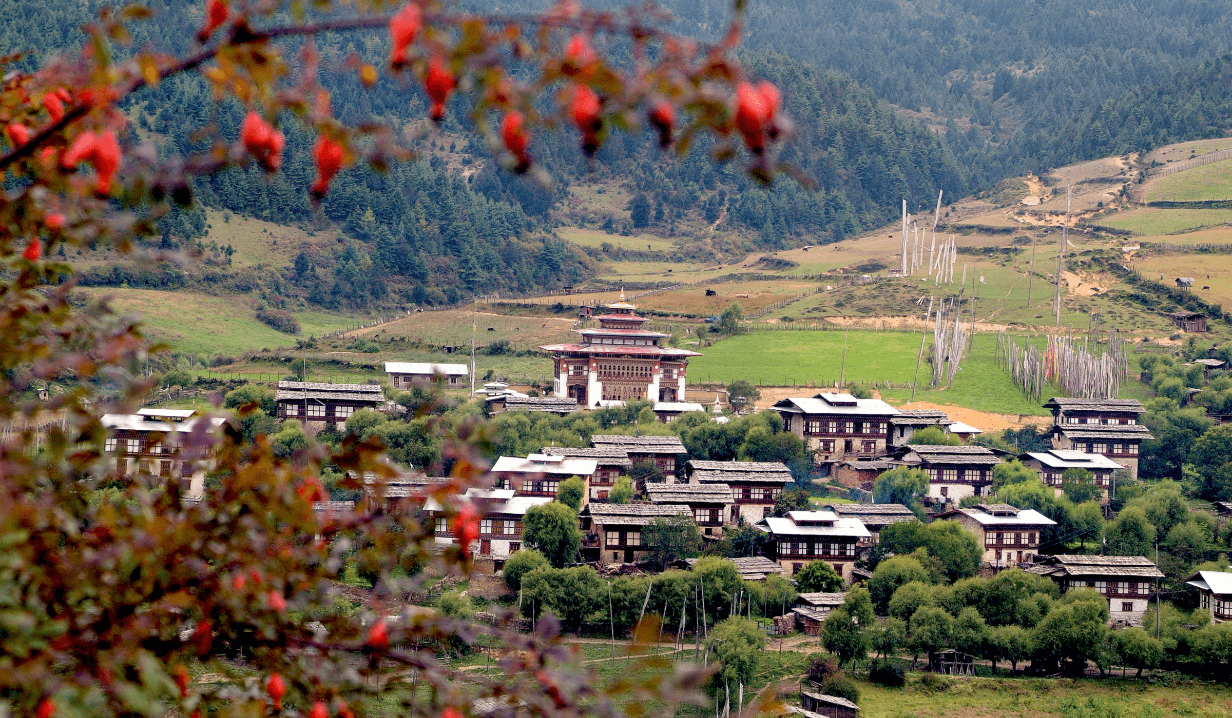 Embark on a private scenic transfer to Gangtey, nestled in the heart of Bhutan’s Phobjikha Valley. As we drive through picturesque mountain roads, enjoy stunning views of lush forests, rolling hills and traditional Bhutanese farmhouses. The serene journey offers glimpses of the valley’s vast wetlands and distant snow-capped peaks.