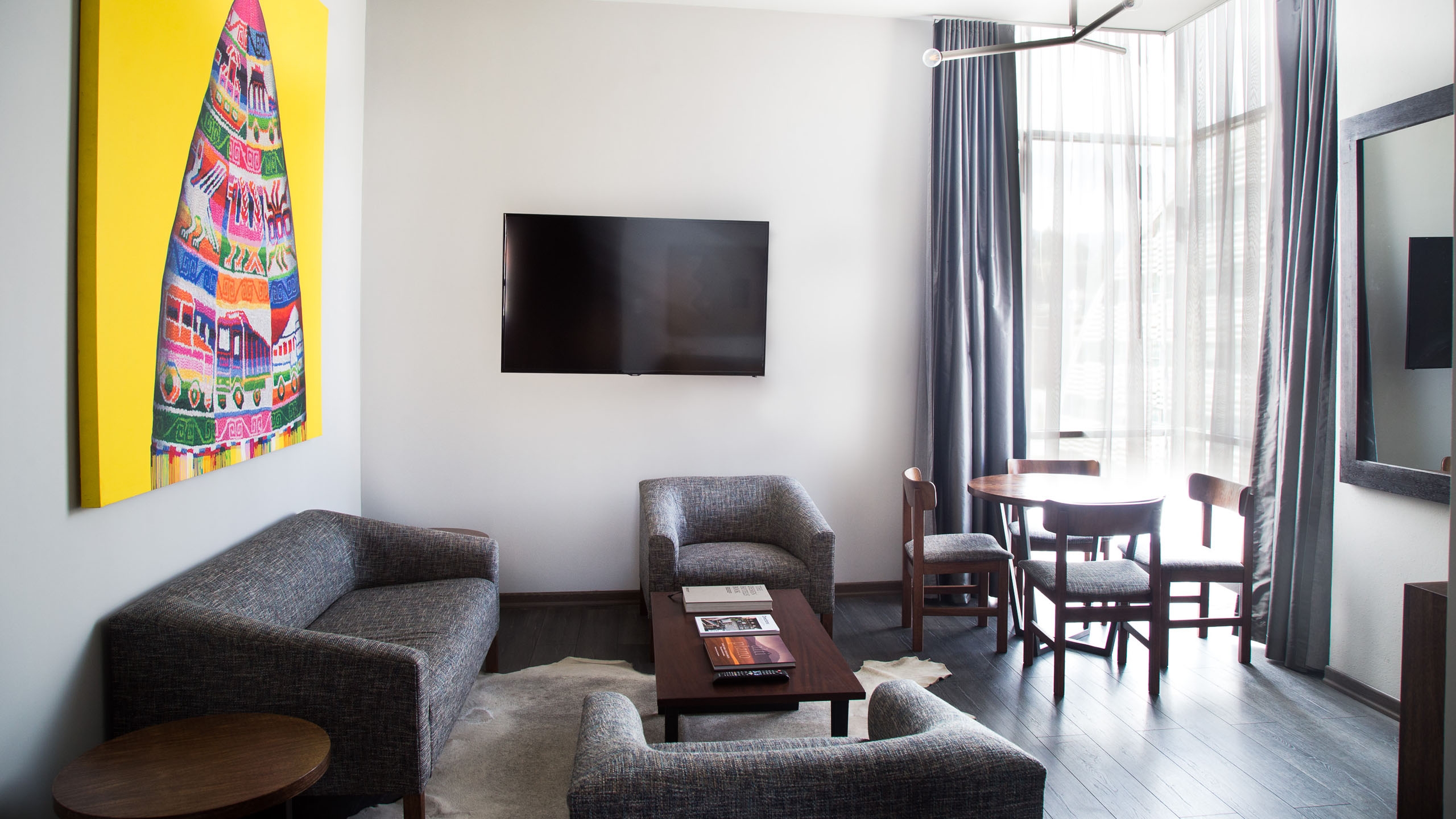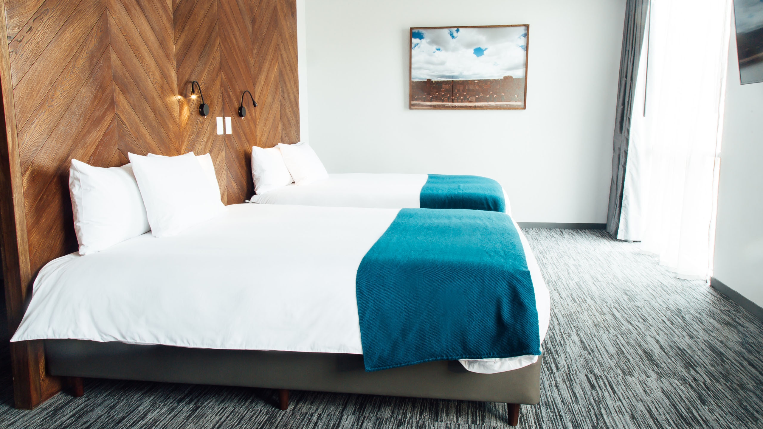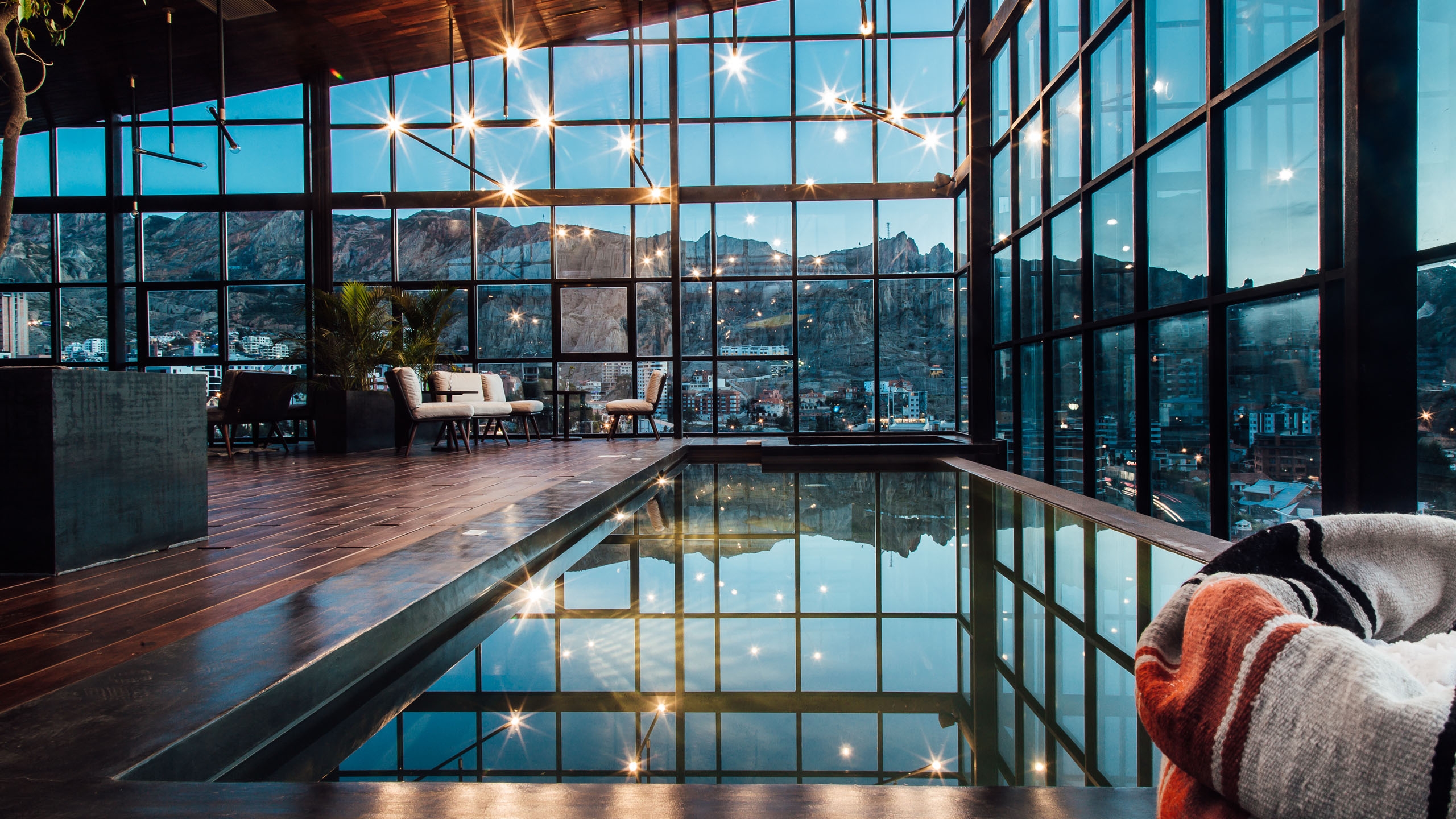 The hotel, which is shaped like a parallelogram, is clad in native Bolivian wood and Comanche stone from a village of the same name 70km outside the city. Inside is no less impressive with photography and artwork from Bolivian artist, Gastón Ugalde, throughout. There are 53 modern, spacious rooms that look out over the mountains that surround the city,  that are simple and sophisticated in design.