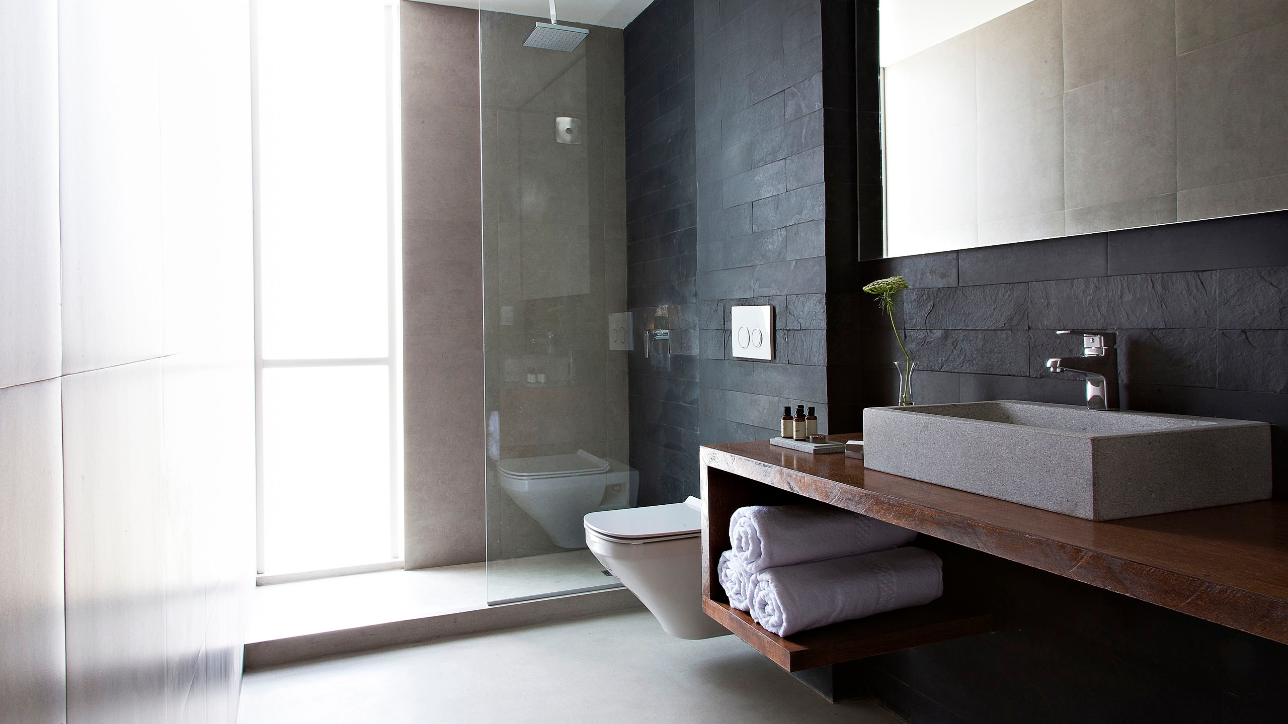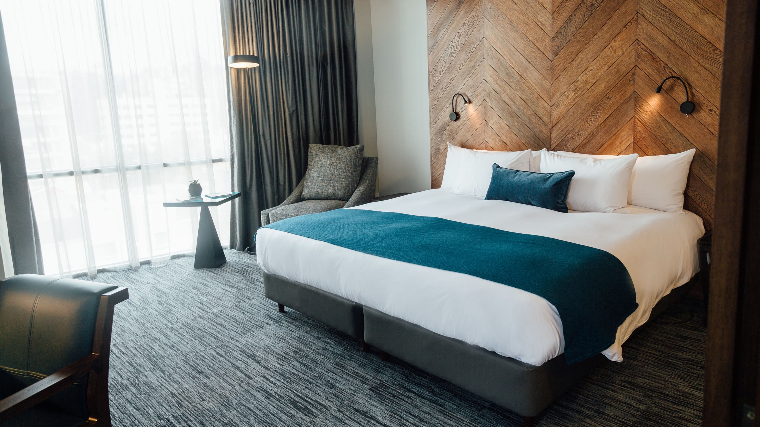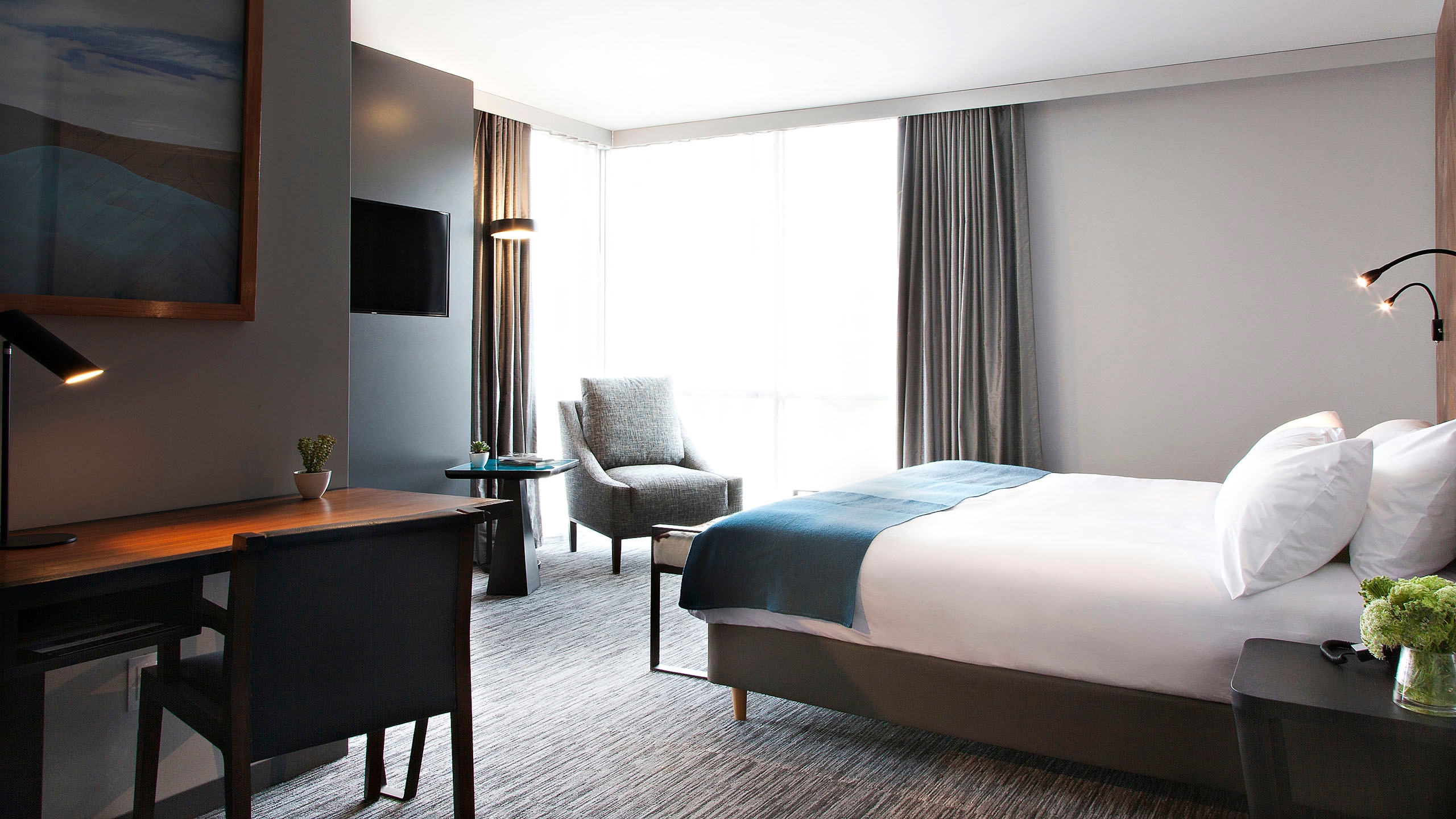 The hotel, which is shaped like a parallelogram, is clad in native Bolivian wood and Comanche stone from a village of the same name 70km outside the city. Inside is no less impressive with photography and artwork from Bolivian artist, Gastón Ugalde, throughout. There are 53 modern, spacious rooms that look out over the mountains that surround the city,  that are simple and sophisticated in design.