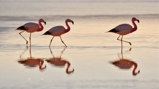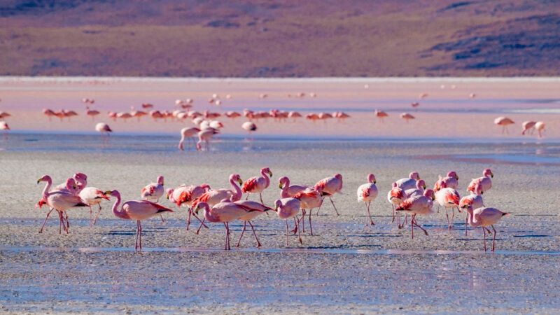 The salt flats are often visited as part of a tour of the surrounding volcanic region which includes visits to hot springs, geysers, lagoons and hotels constructed from salt. Spend the rest of your time admiring elegant pink flamingoes, visiting multi-coloured lagoons and taking a soak in restorative volcanic springs.