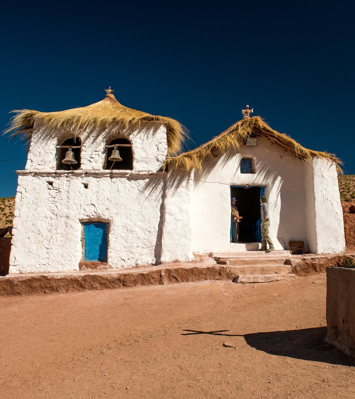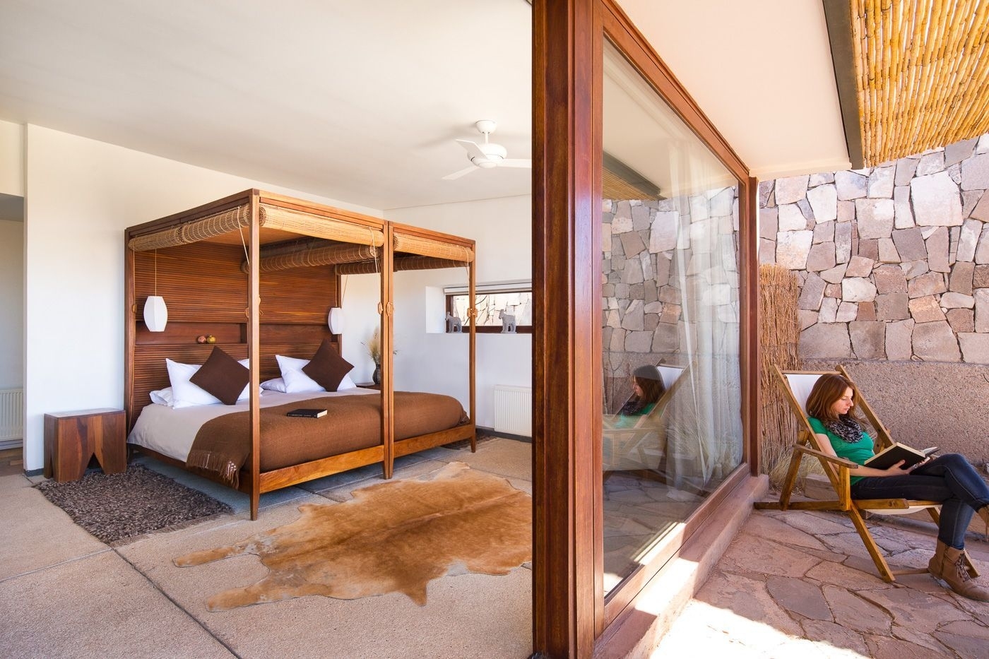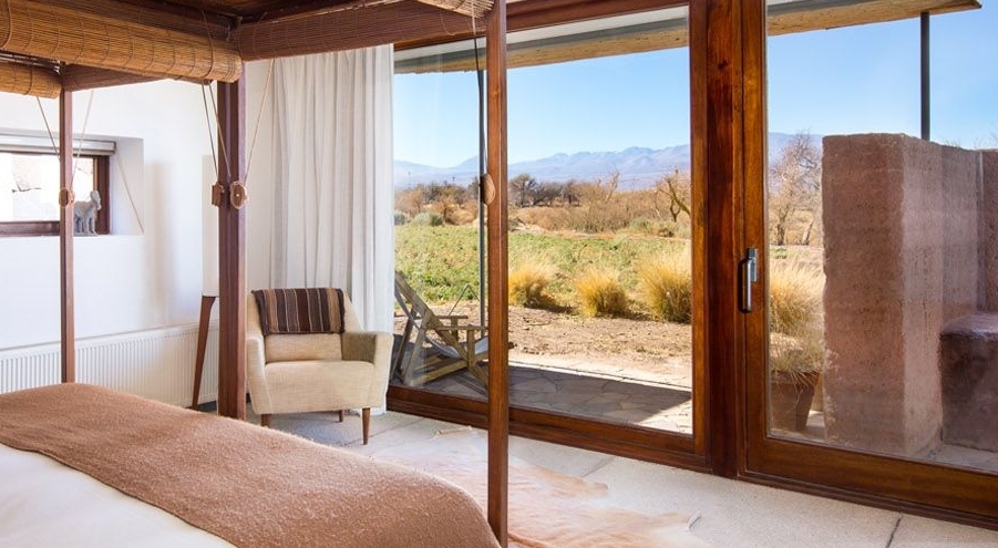 Within the guest rooms you’ll find touches of local culture everywhere, from handwoven throws to cowhide rugs and llama figures carved from the volcanic rock of nearby Toconao. Rooms range from the Oriente rooms, which feature private terraces and volcanic views, to the apartments. These can accommodate up to six people and are spread over two floors. All rooms look out over the Andes mountain range and nearby volcanoes, with views of the desert available from dusk until dawn.
