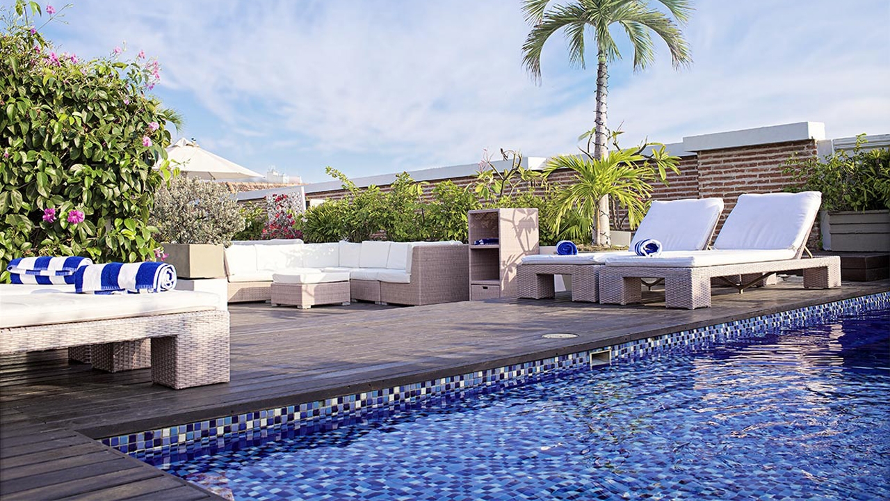 There is a small lounge area downstairs where guests will enjoy breakfast. As you head further into the hotel there is a small pool then a spectacular roof terrace filled with beautiful plants and featuring another small swimming pool. This is a wonderful place to relax and watch the sun set over Cartagena.
