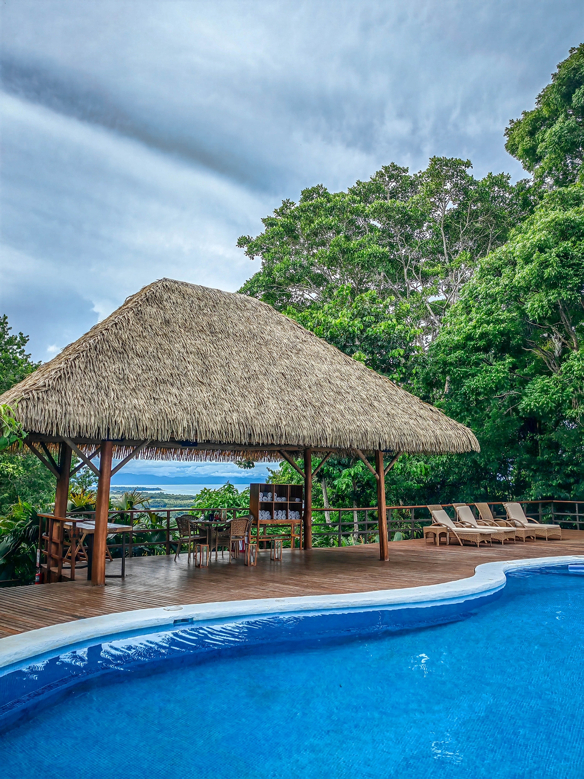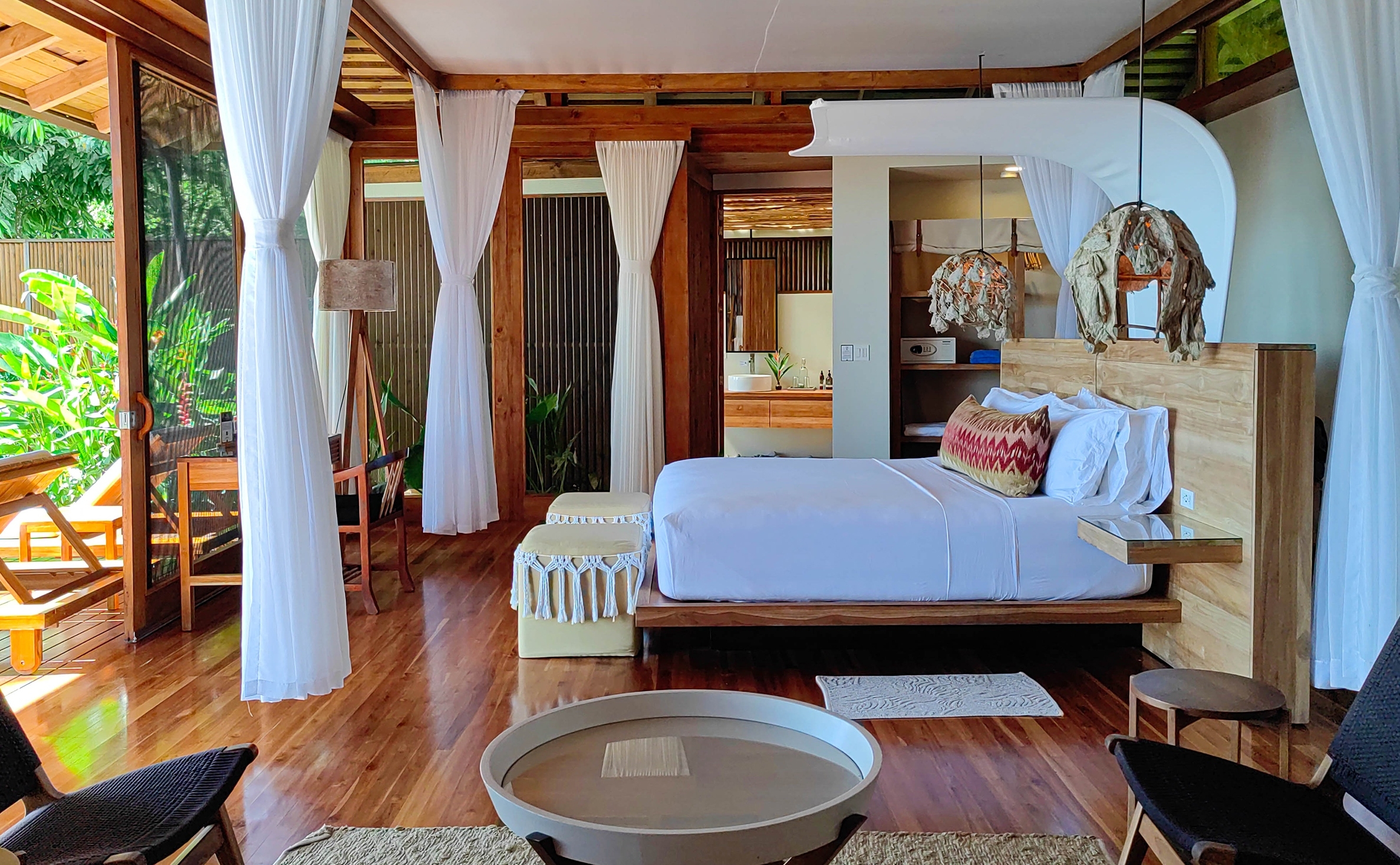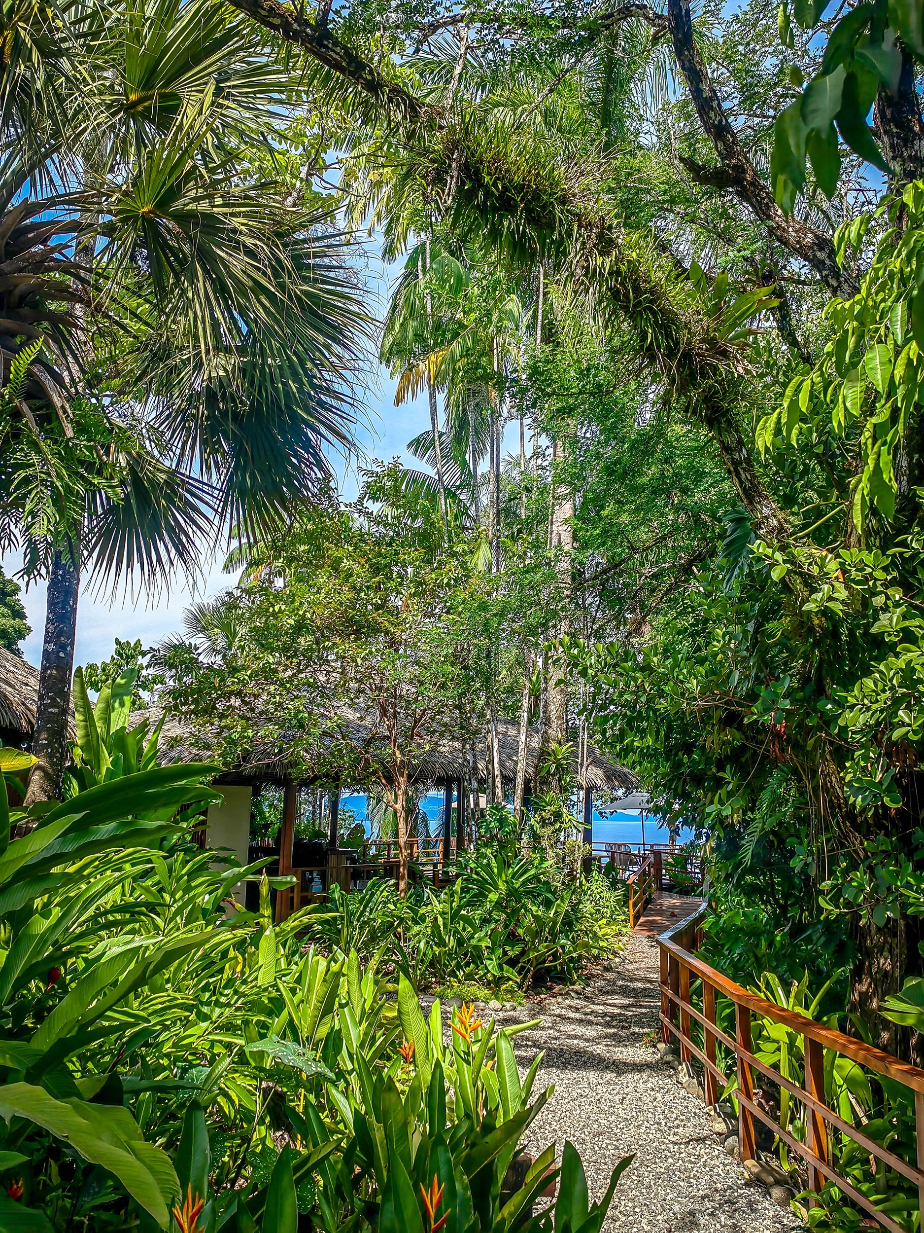 The hotel and each bungalow have sweeping views of the Pacific and rainforest canopies, and it’s a short downhill walk to a quiet and beautiful beach for a dip in the ocean.