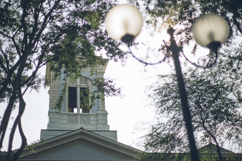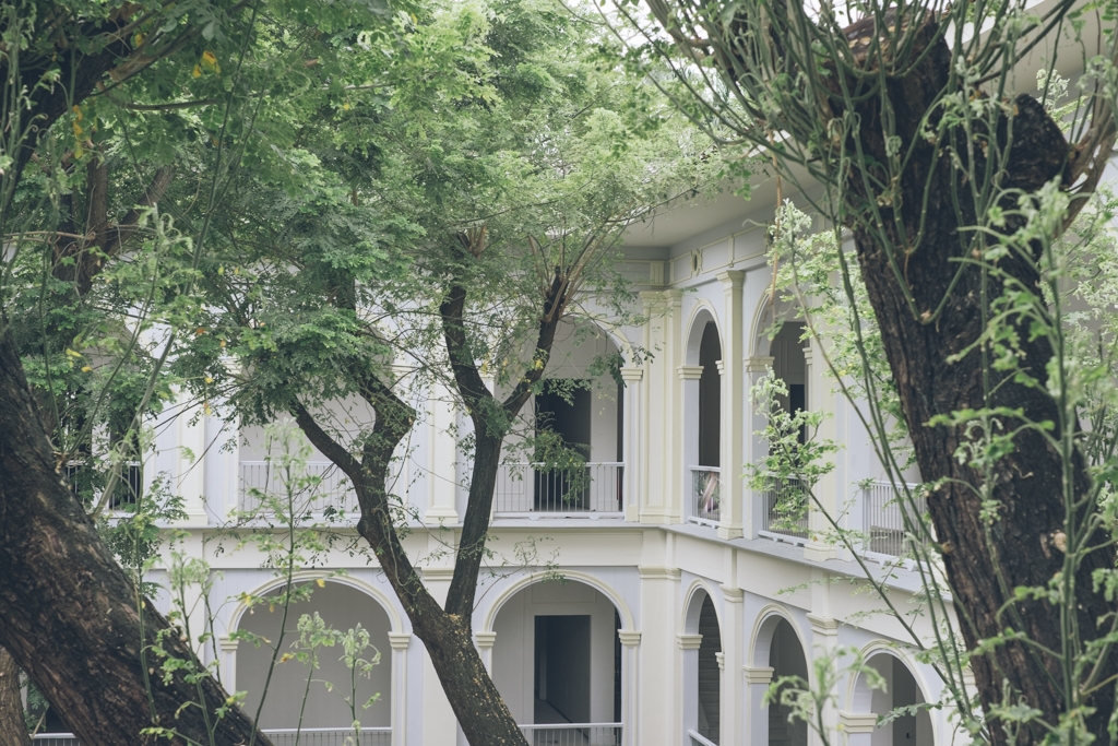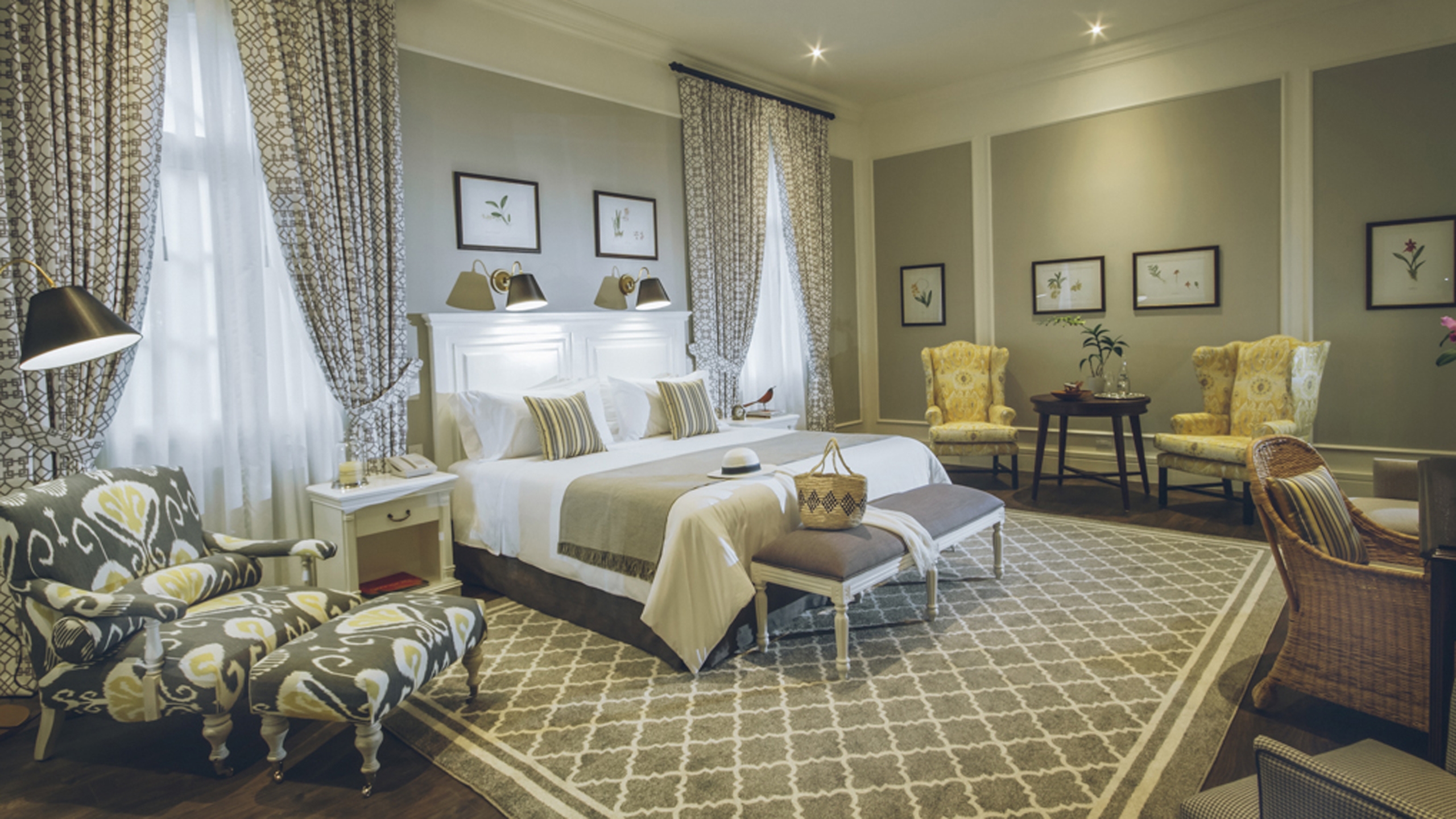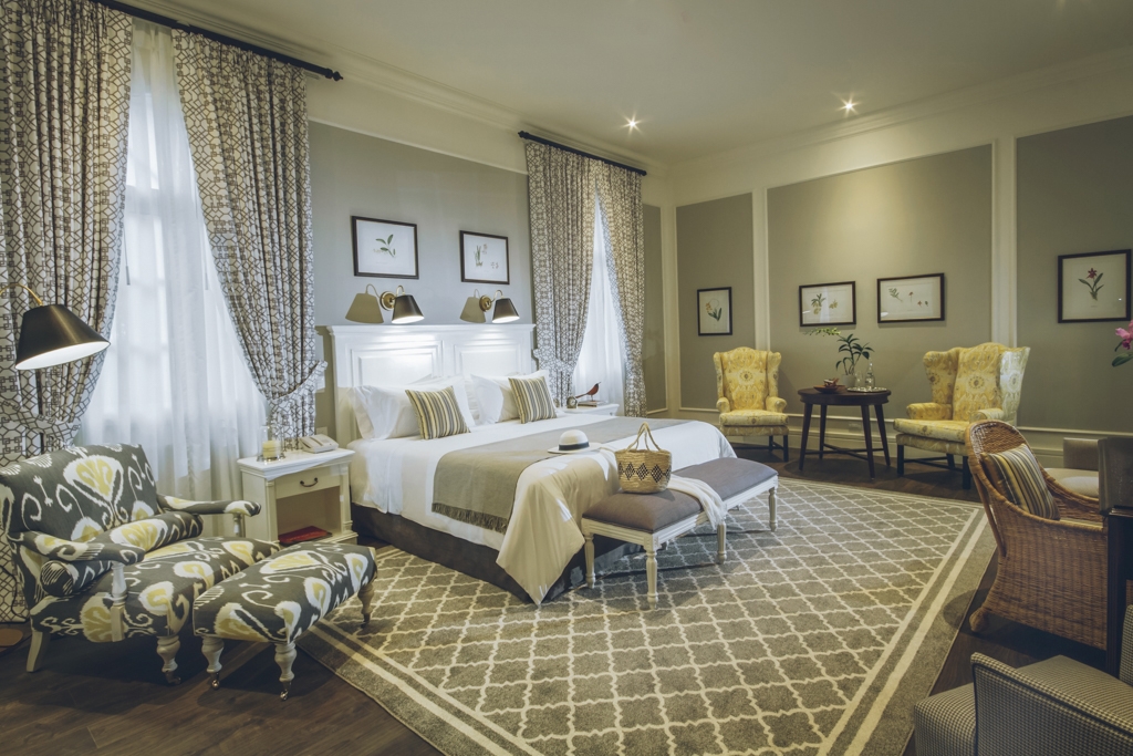 There are 44 guest rooms classically furnished with period local pieces, in subdued hues to contrast with the tropical park outside.