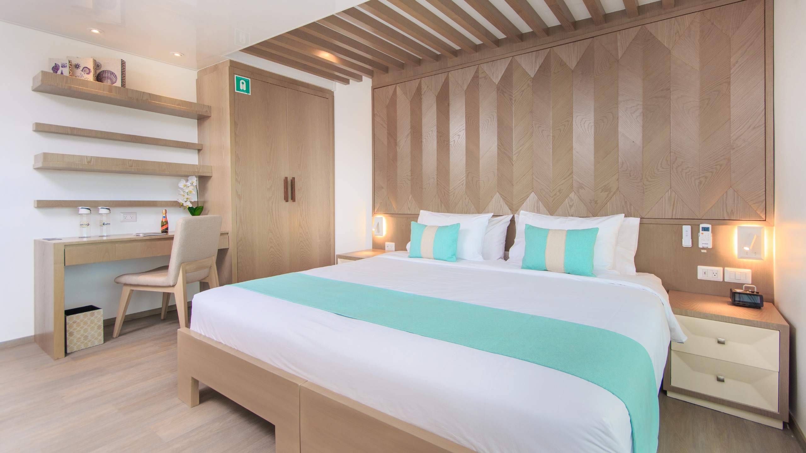 This all-suites ship is an idyllic vessel on which to explore the waters surrounding the astonishing Galápagos Islands. After spending days on land, meeting blue-footed boobies and sea lions and giant tortoises, you’ll be able to return to relax in your spacious bedroom complete with balcony and writing desk.