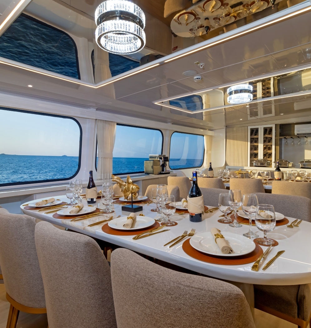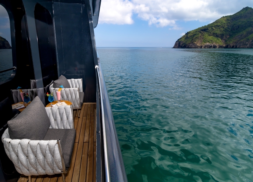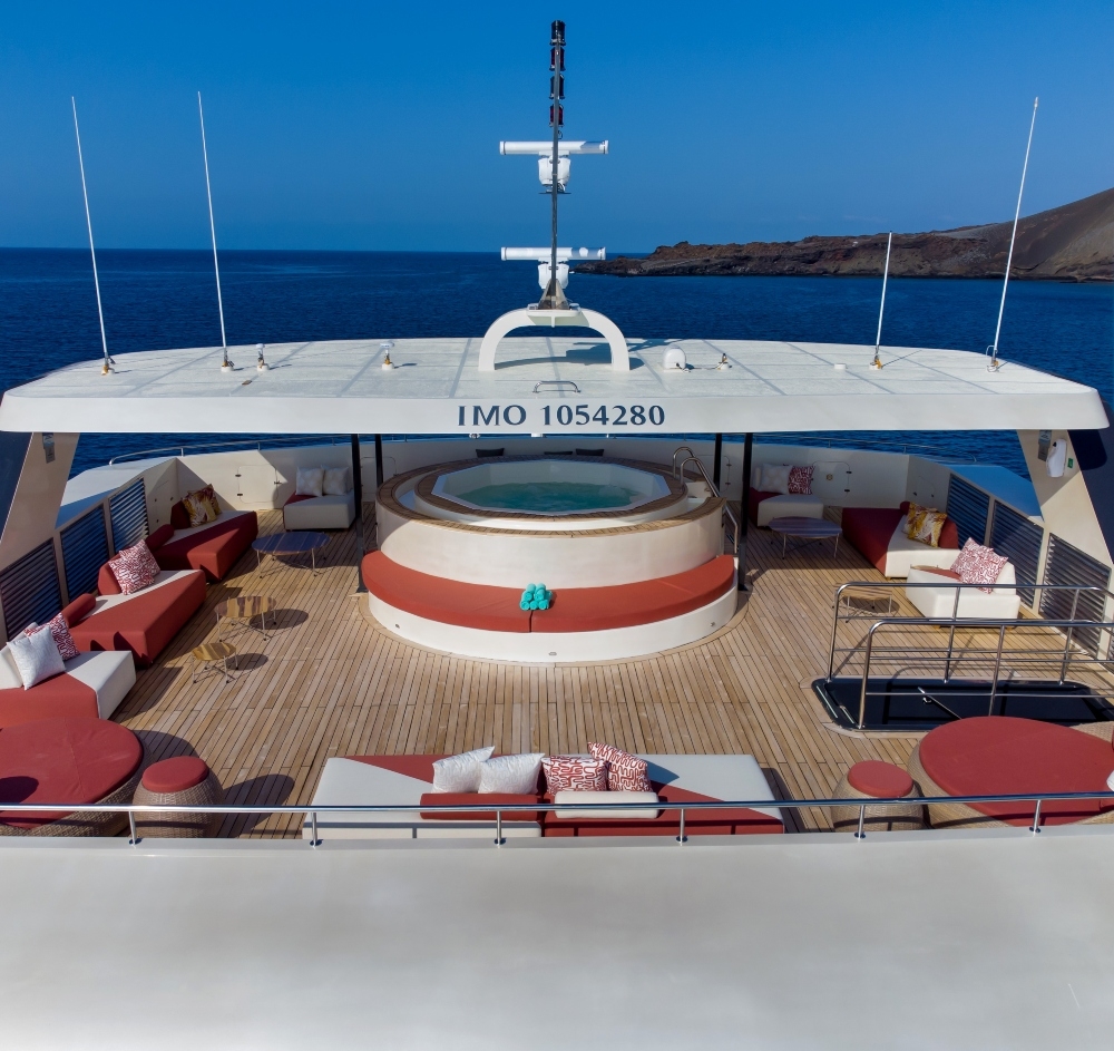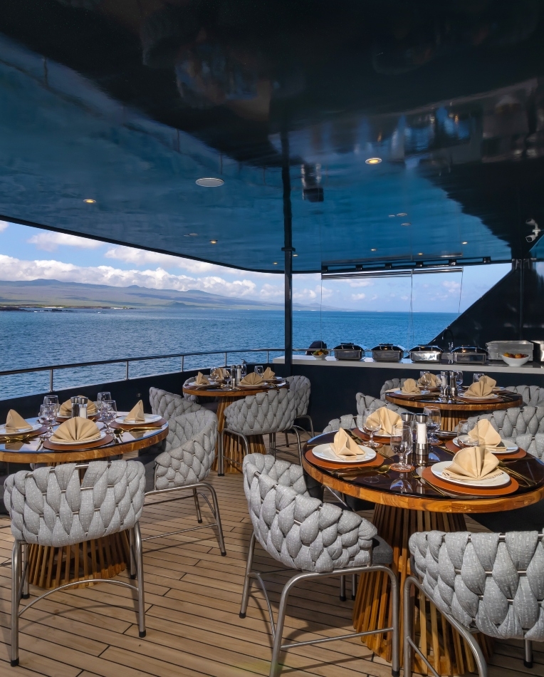 Relax and unwind in the elegant living room, the ideal place to enjoy time at sea with other travellers, or soak up the sunlight and breathtaking panoramic views as you stargaze from the sun deck. You can also immerse yourself in the beauty of the Galápagos Islands as you sip on your favourite drinks in the alfresco lounge, or savour the exceptional cuisine prepared by the expert chefs in the dining room.