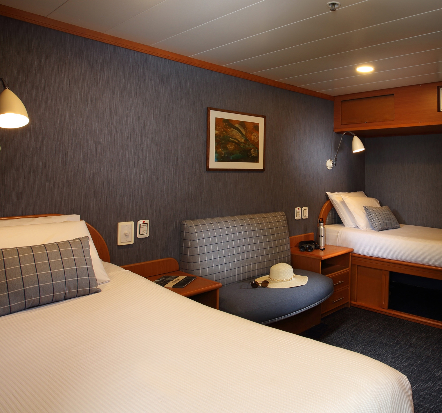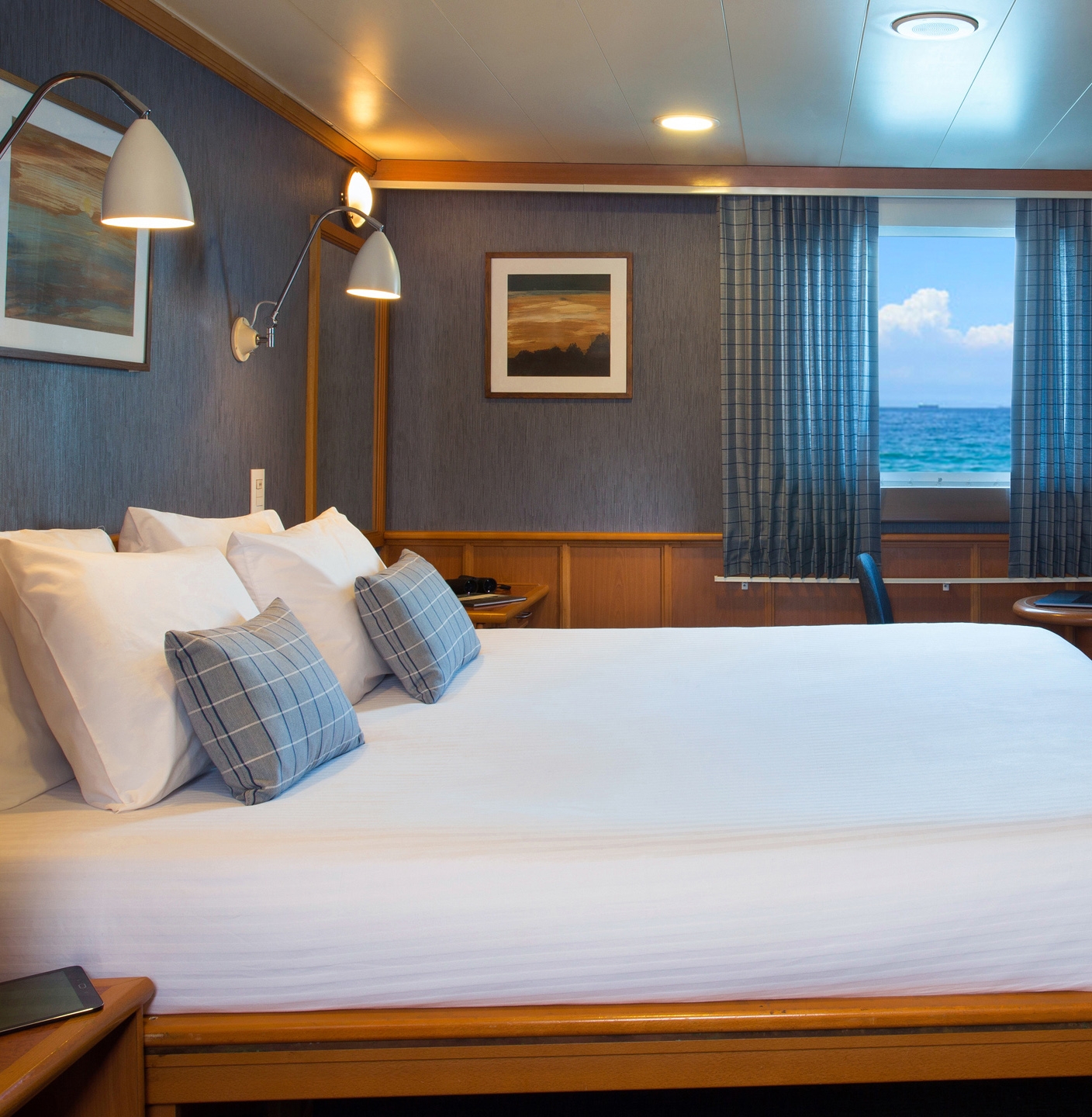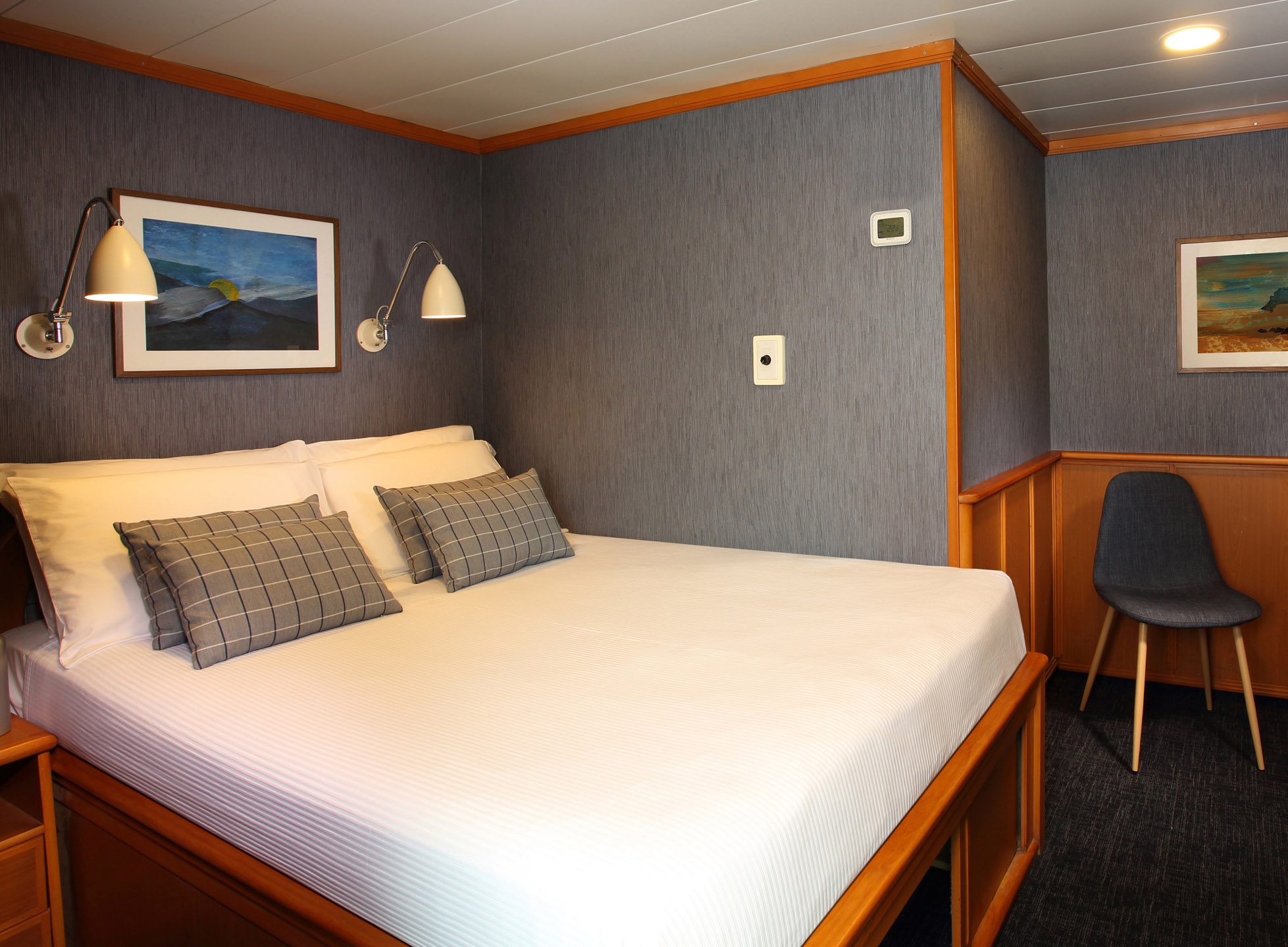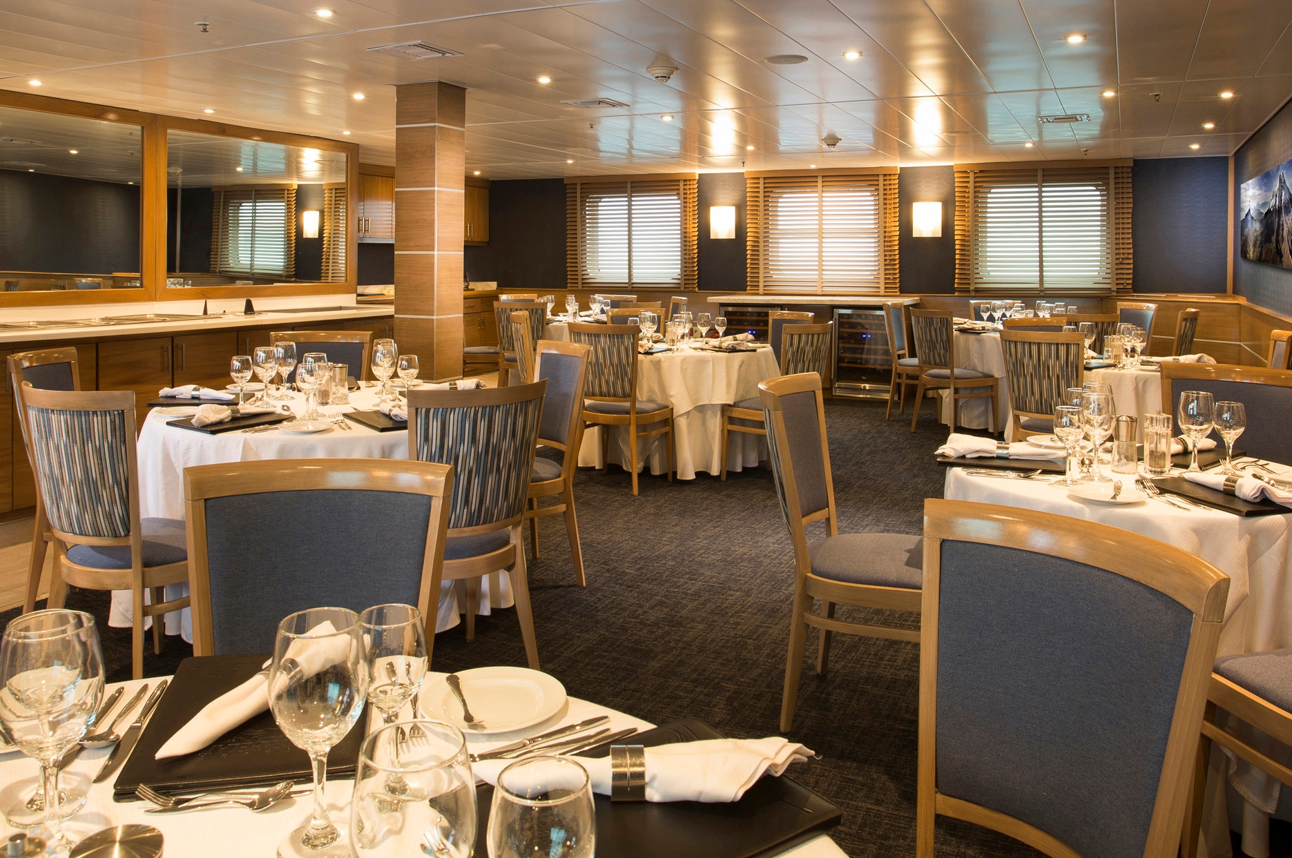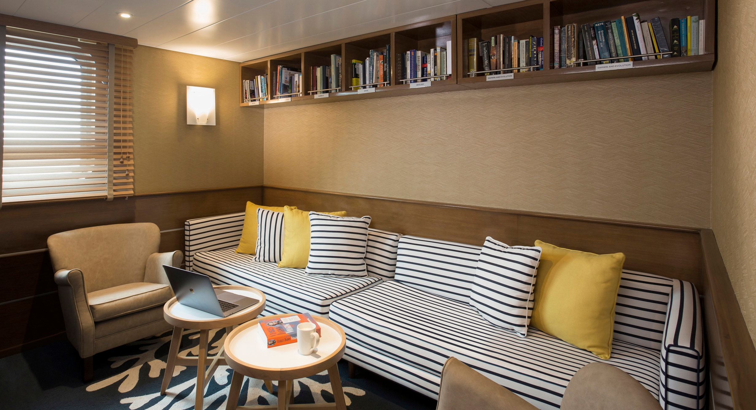 The 20 cabins are relatively spacious with double, twin and triple rooms available. Decor is modern and sophisticated. On the main deck you’ll find the dining room, library and bar while the boat deck is home to the fitness room, an al fresco bar and hot tub.