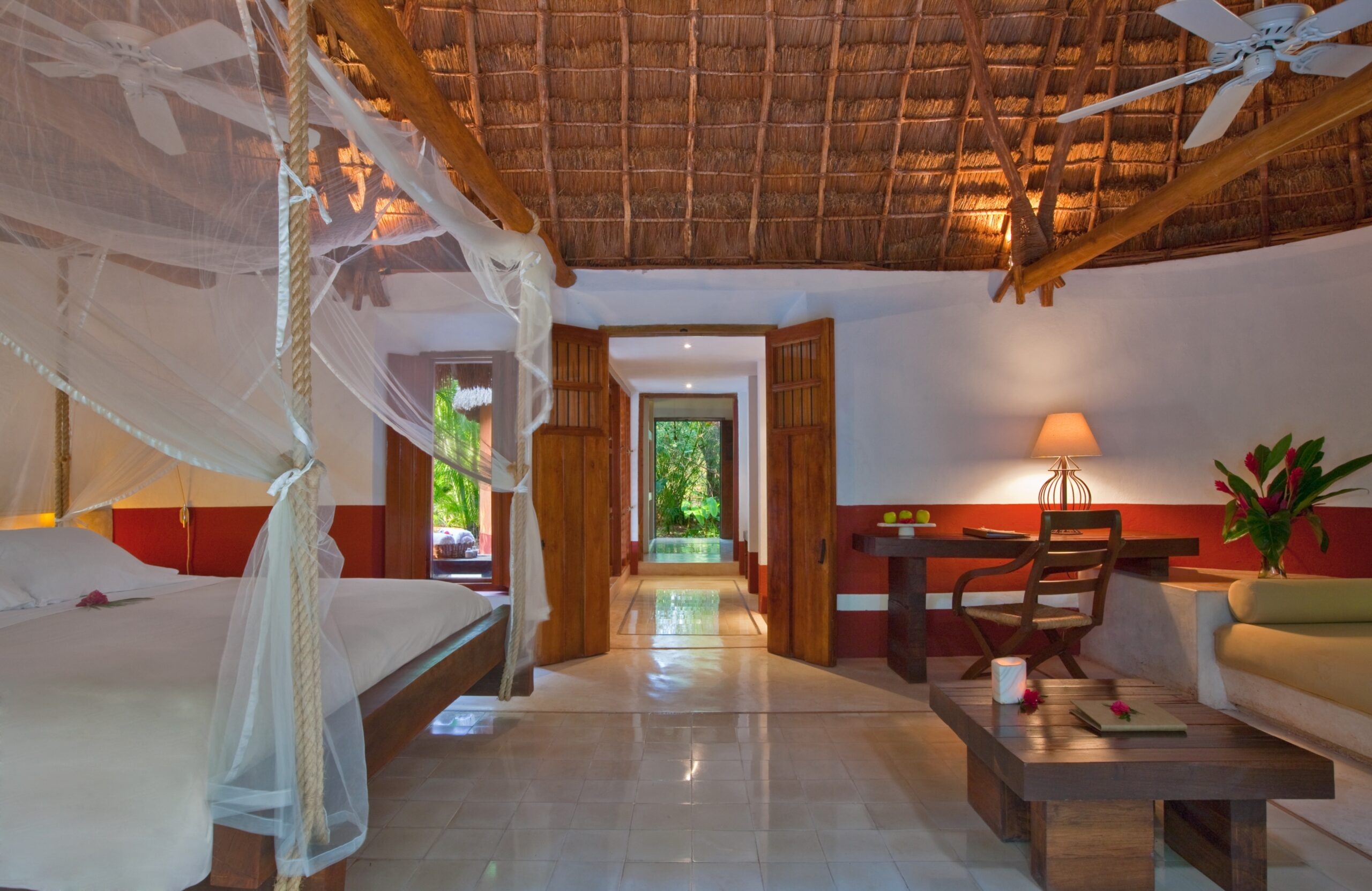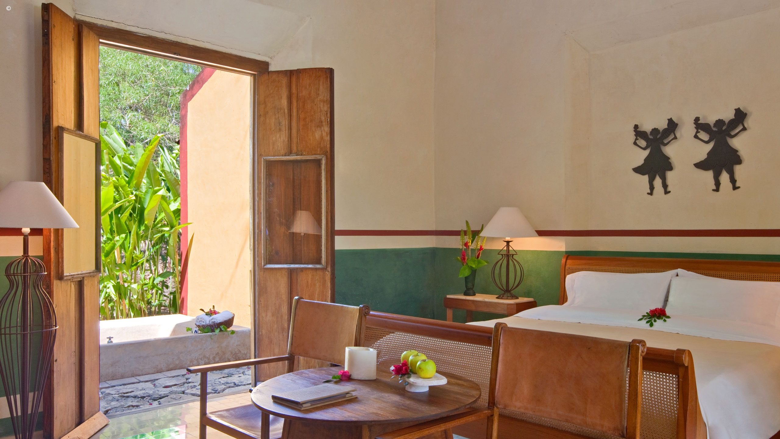 The main house sits amidst lush tropical gardens, with stone pathways leading to tranquil courtyards and a striking swimming pool. The hacienda’s 15 guest rooms retain their 19th-century layout and aesthetic of earthy hues, airy interiors and handcrafted furnishings. For those seeking further seclusion, four original Mayan villas have been lovingly repurposed into private suites. Each features a shaded terrace, outdoor Jacuzzi and garden views that offer a sanctuary surrounded by centuries-old ceiba trees and stone walls laced with vines.