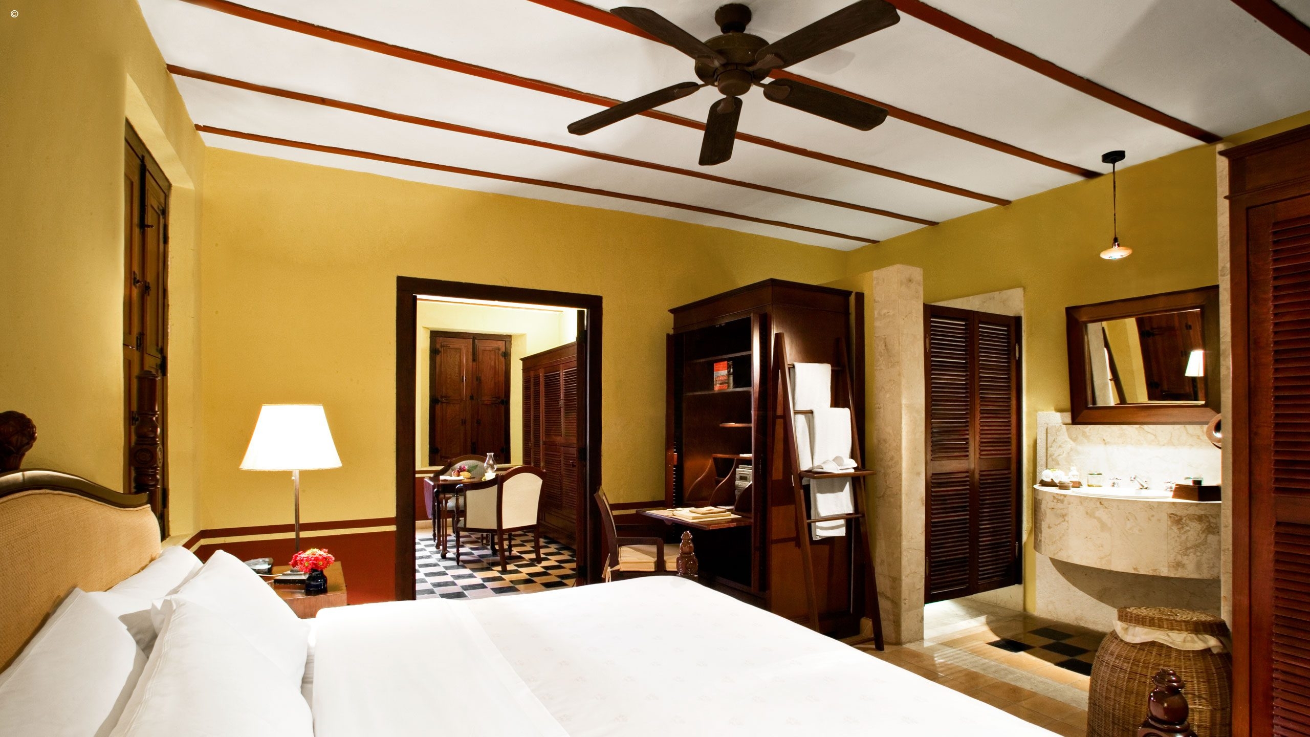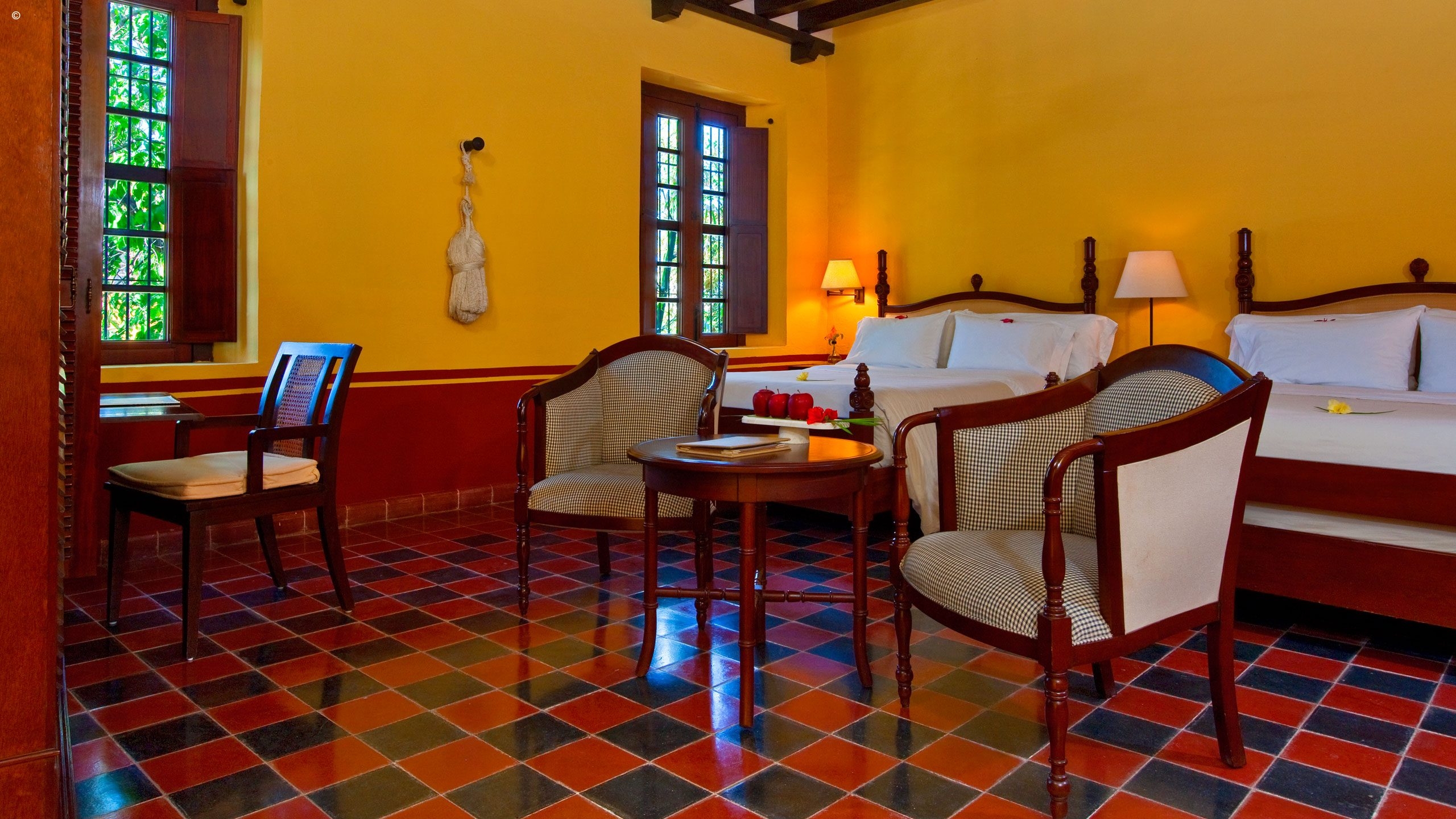 A characteristic blend of faded yellows, oranges, terracotta and rusty reds meet you, and its typical Colonial-style rooms echo a sober, refined elegance fitted out with the usual modern amenities for high comfort.