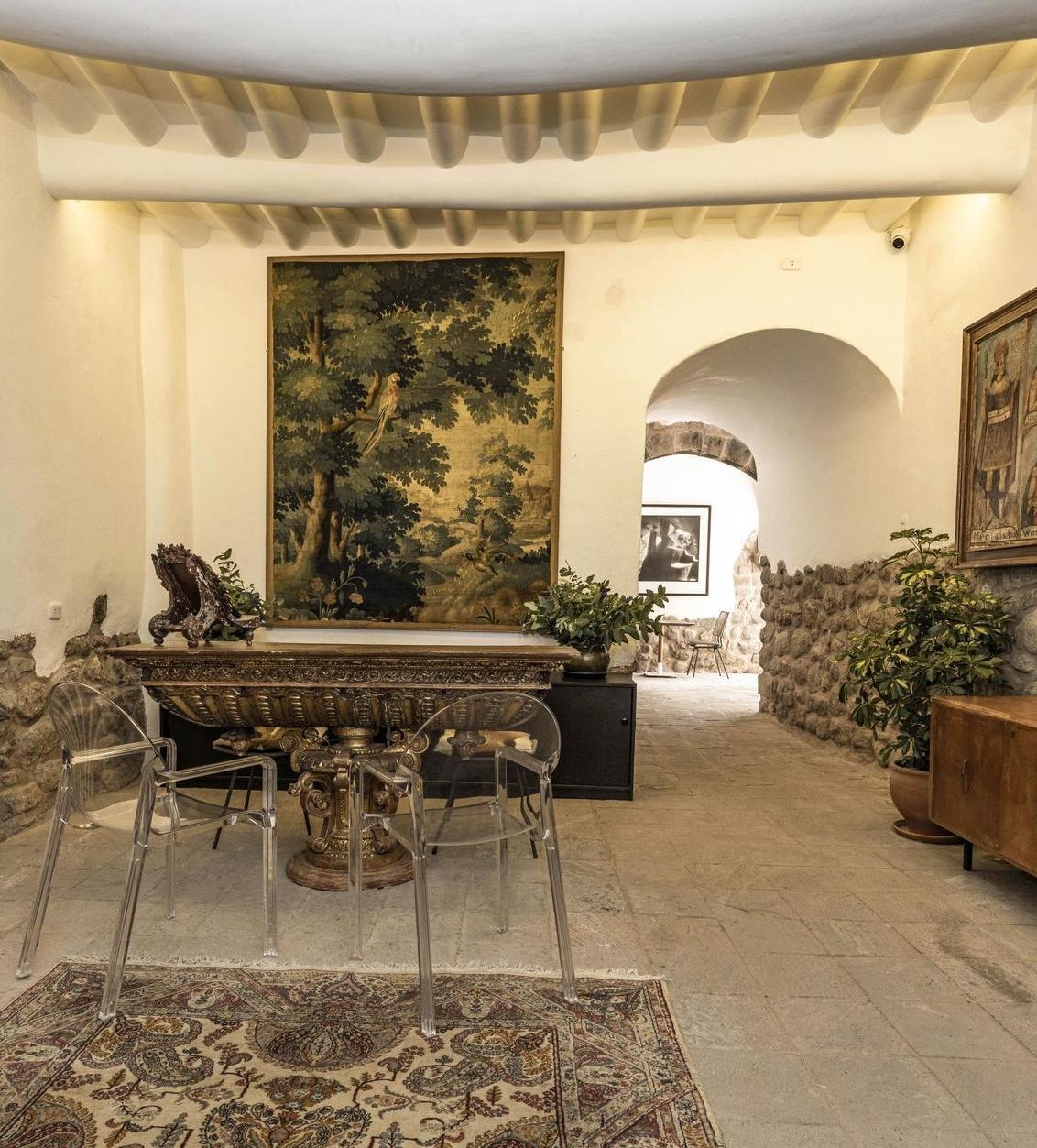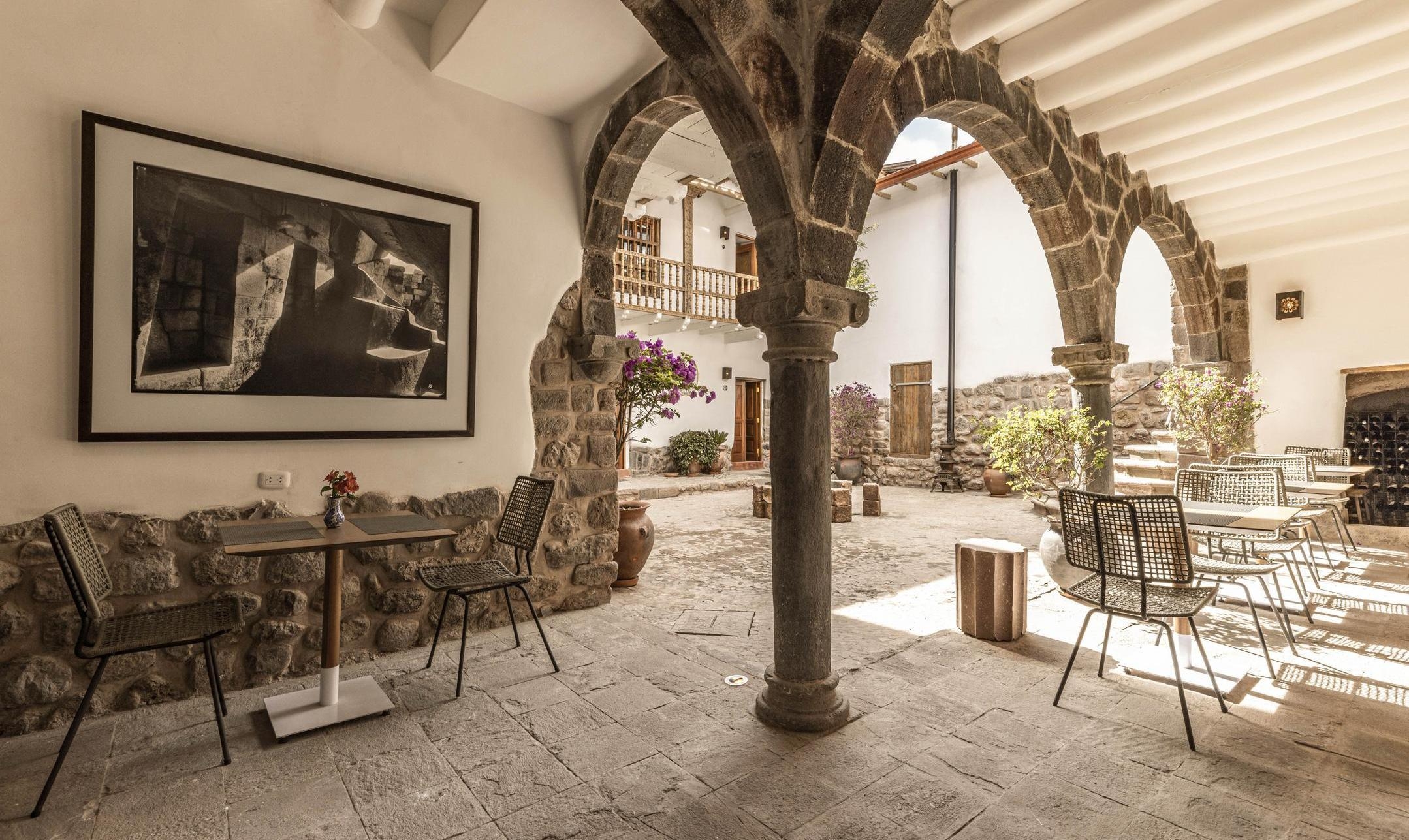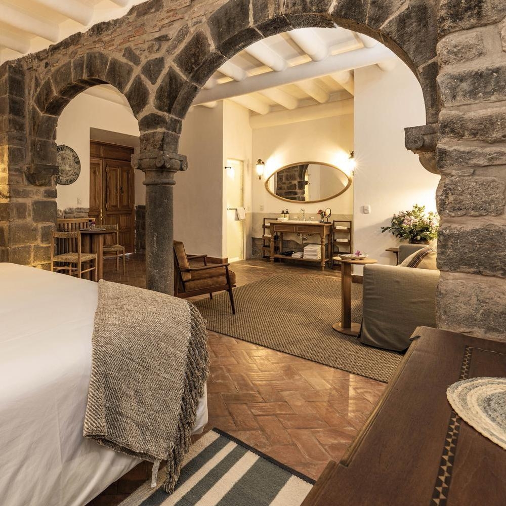 An intimate charm infuses the atmosphere here; there are only eight suites, each wonderfully spacious and distinct in its styling. You’ll notice typical Cusquenian details woven into their design, and across the hotel, including artisanal décor, preserved stonework and Inca ceramics. Adding to the sense of place are beamed ceilings, earthy palettes and original photographs by Peruvian photographer Martín Chambi.