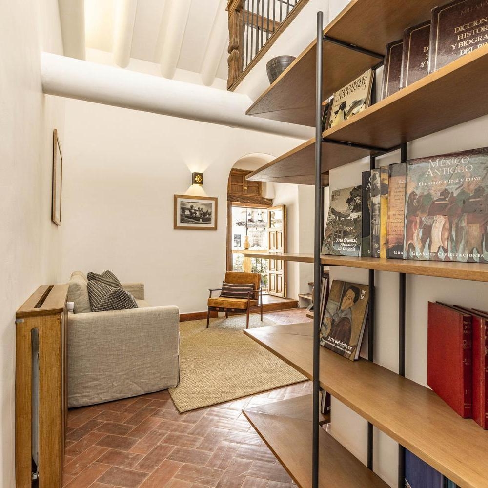 From a Balcony Suite, the largest of the collection, you can look across the peaceful Plaza Nazarenas. A carved door opens into its separate living area, whose staircase leads up to a bedroom raised on a mezzanine level.