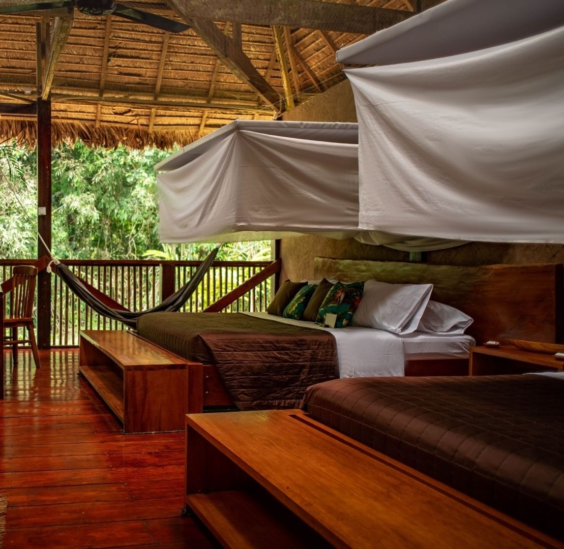 Just getting to Posada Amazonas is an adventure, as you’ll embark on a 45-minute boat journey along the Rio Tambopata to reach its welcoming wooden decks. Once here, you’ll be greeted by the local community who make up much of the staff at the lodge, and shown to your room where swinging hammocks and handmade wooden beds await.