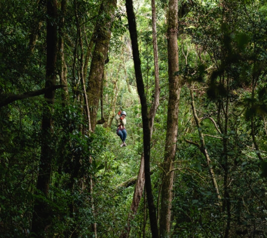 Glide effortlessly along eight galvanized stainless steel cables, ranging from 80 meters (262 feet) to an astounding 750 meters (2460 feet) in length, with an average height of 38 meters (125 feet) above the forest floor.