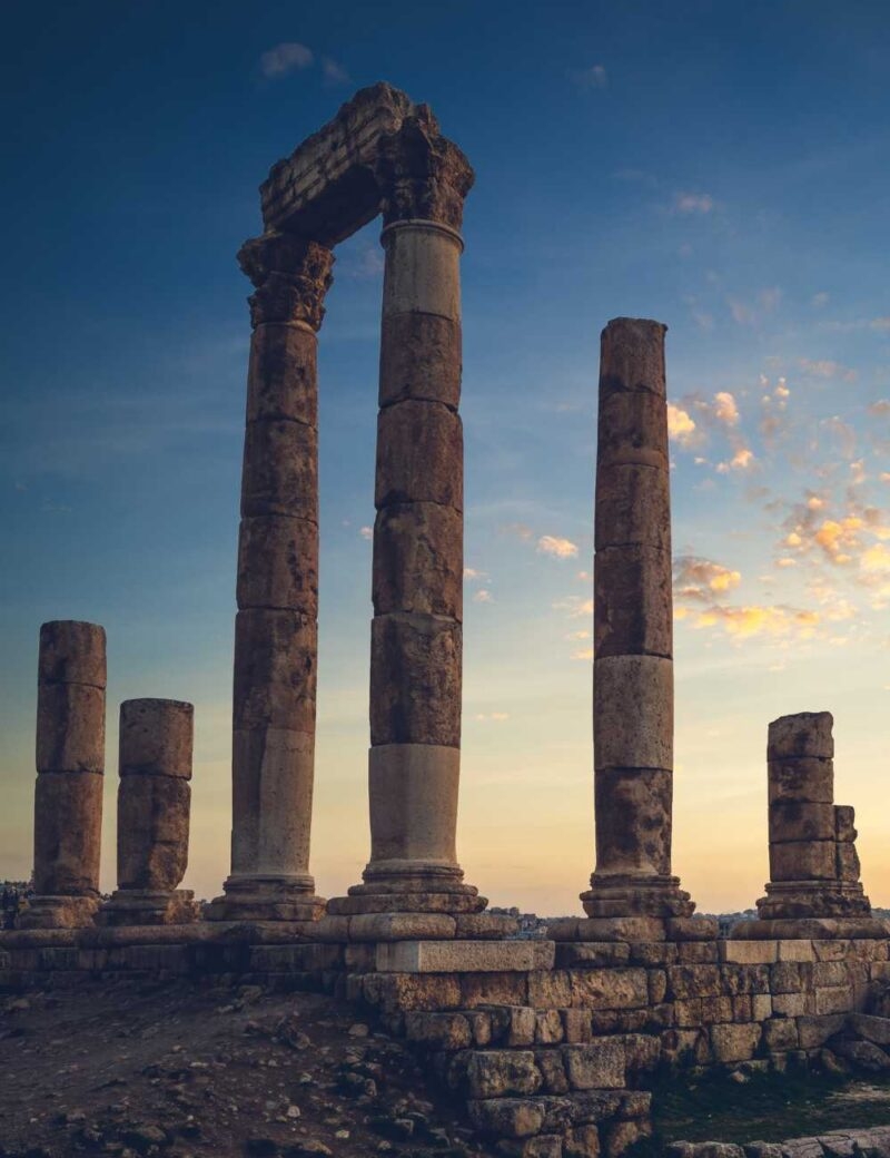 Amman is home to impressive ancient ruins that intermingle with modern architecture and daily life. Perched on a hill, overlooking the city is Amman’s Citadel, home to the Roman Temple of Hercules with its seemingly precarious stone beams balancing between the ancient columns. Then there’s the smooth, restored domed roof of the Umayyad Palace, a large palatial complex that dates back to the 8th century.