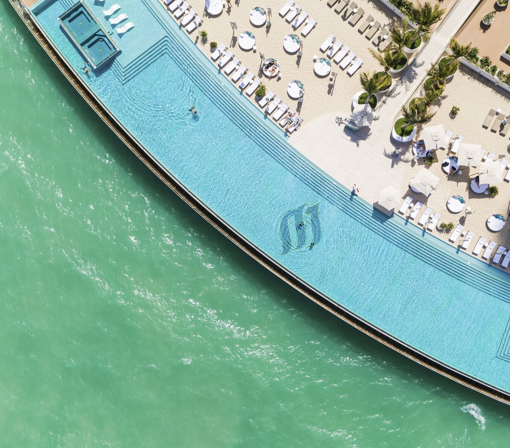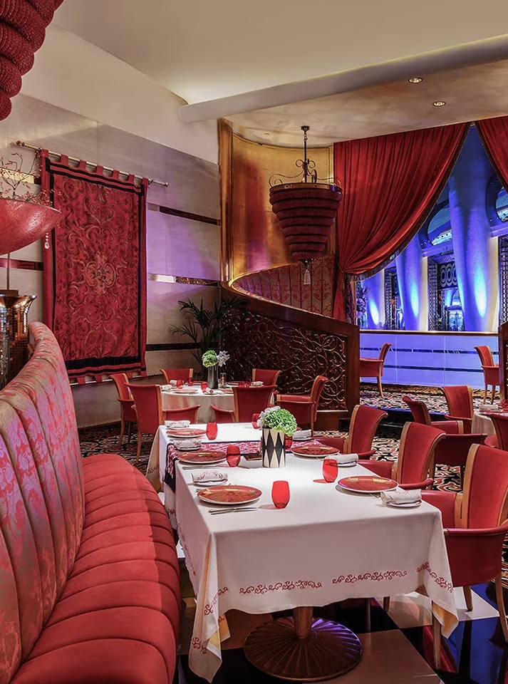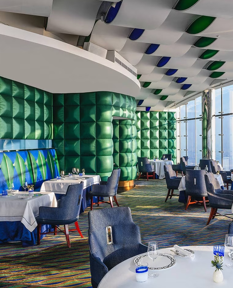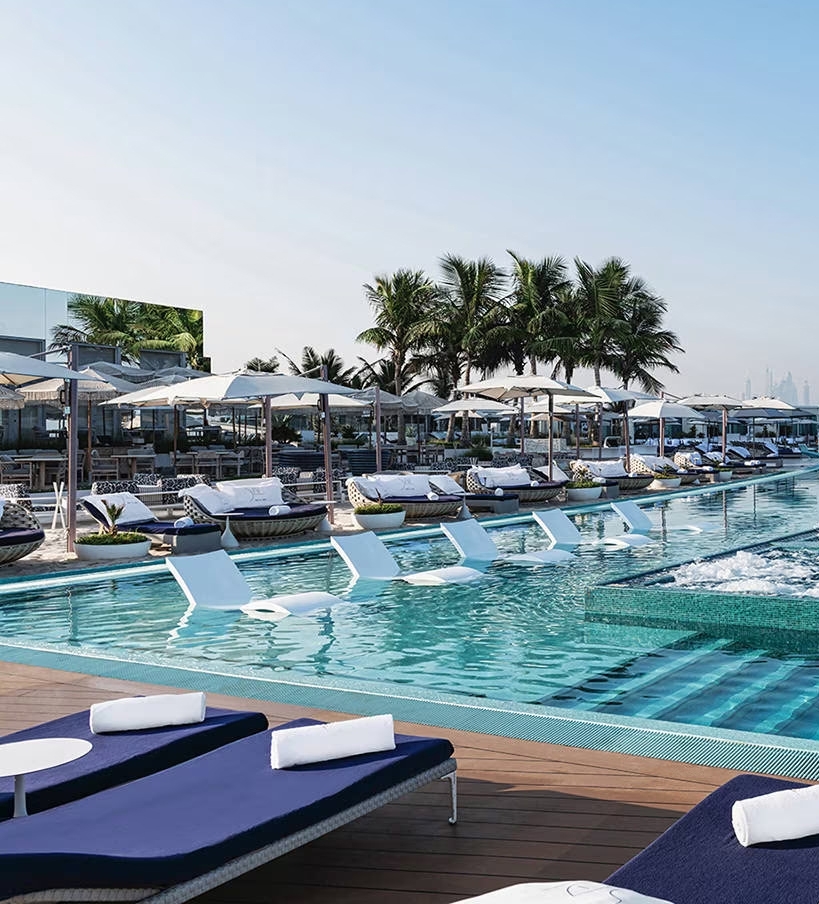 Bedrooms here are lavish, with two-storey duplexes and sea-view suites, furnished with velvet chaise lounges and built-in dressing rooms. Each has a spectacular view, either of the open seas beyond the island, or facing back towards the city where glittering skyscrapers huddle on the mainland.