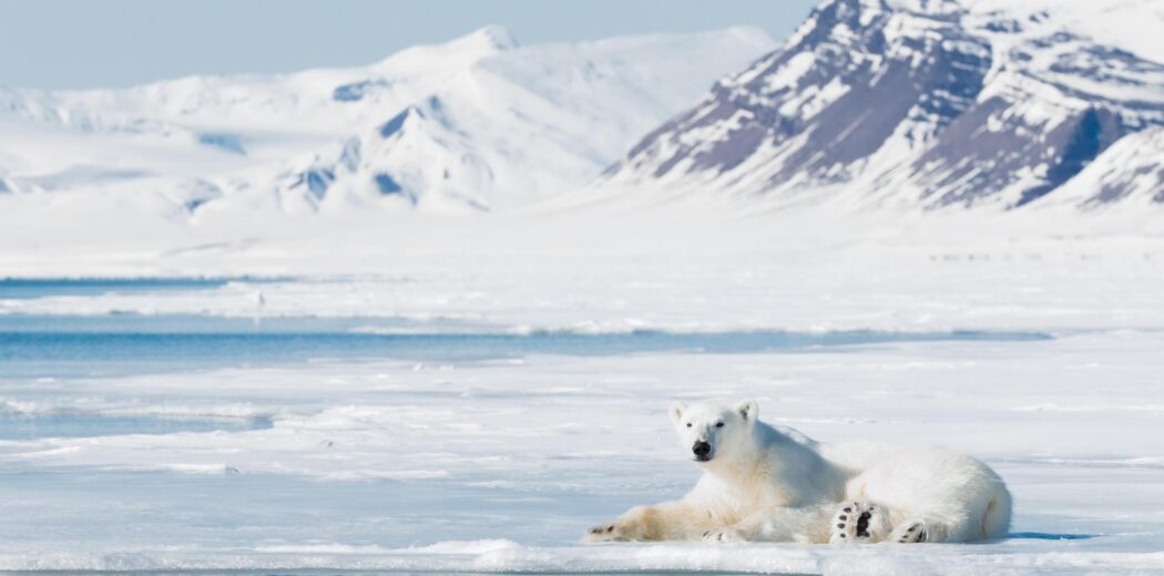 A polar bear walking in south Spitsbergen, Svalbard with snowy mountains in the backdrop.