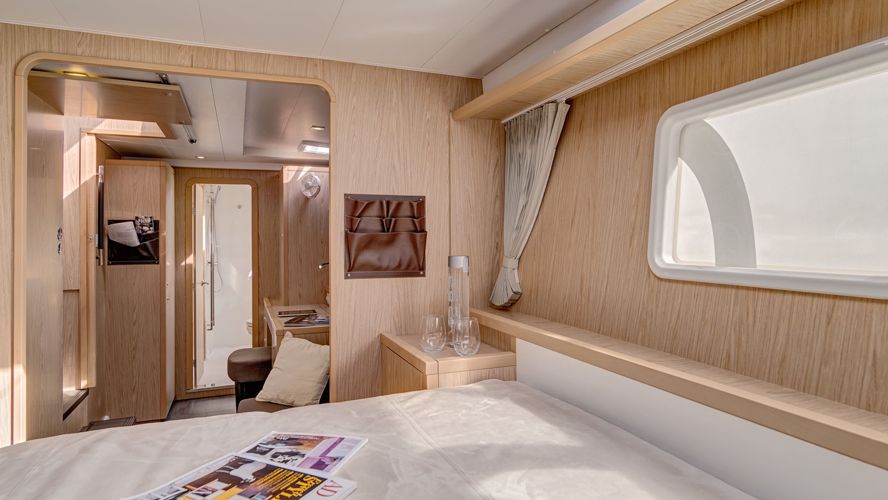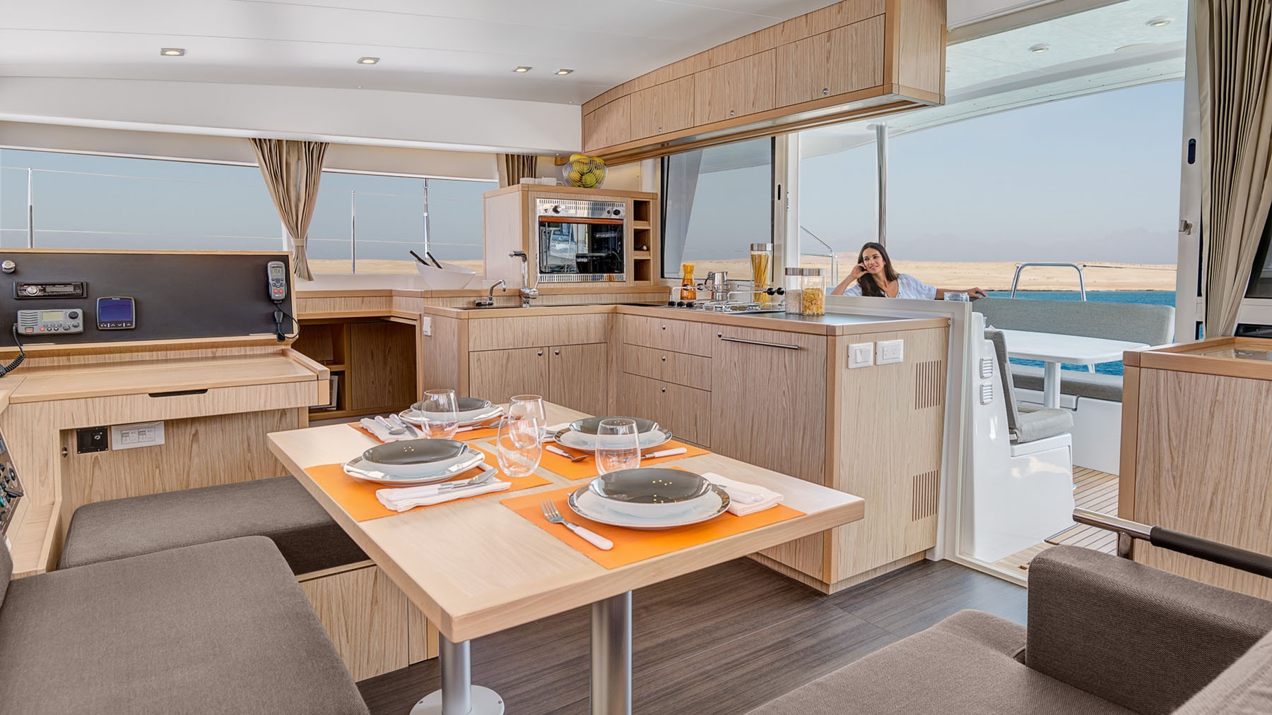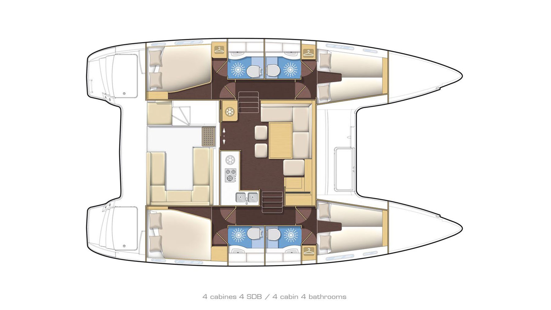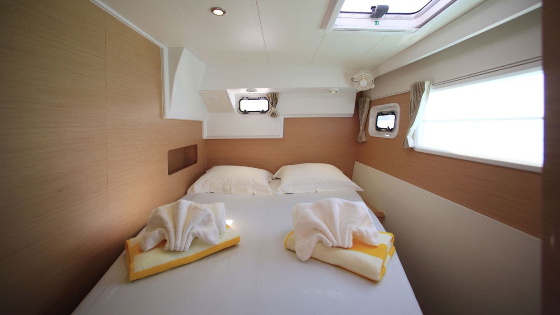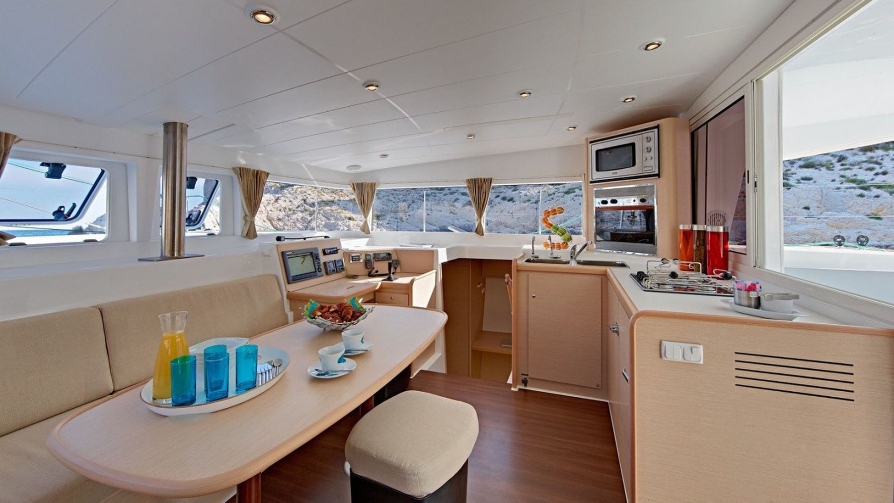 The Lagoon 400 is a luxurious and spacious catamaran with four double cabins, each with air conditioning and en suite bathrooms. There’s a large living area with 360° views as well as two outdoor relaxation spaces, one in the front cockpit with the trampoline, and the other one in the back cockpit.