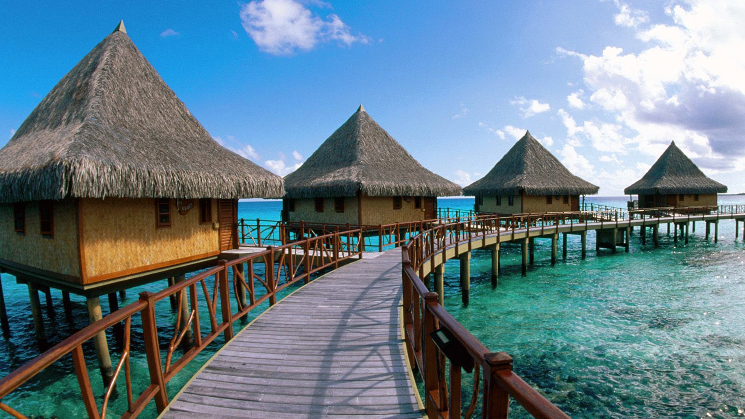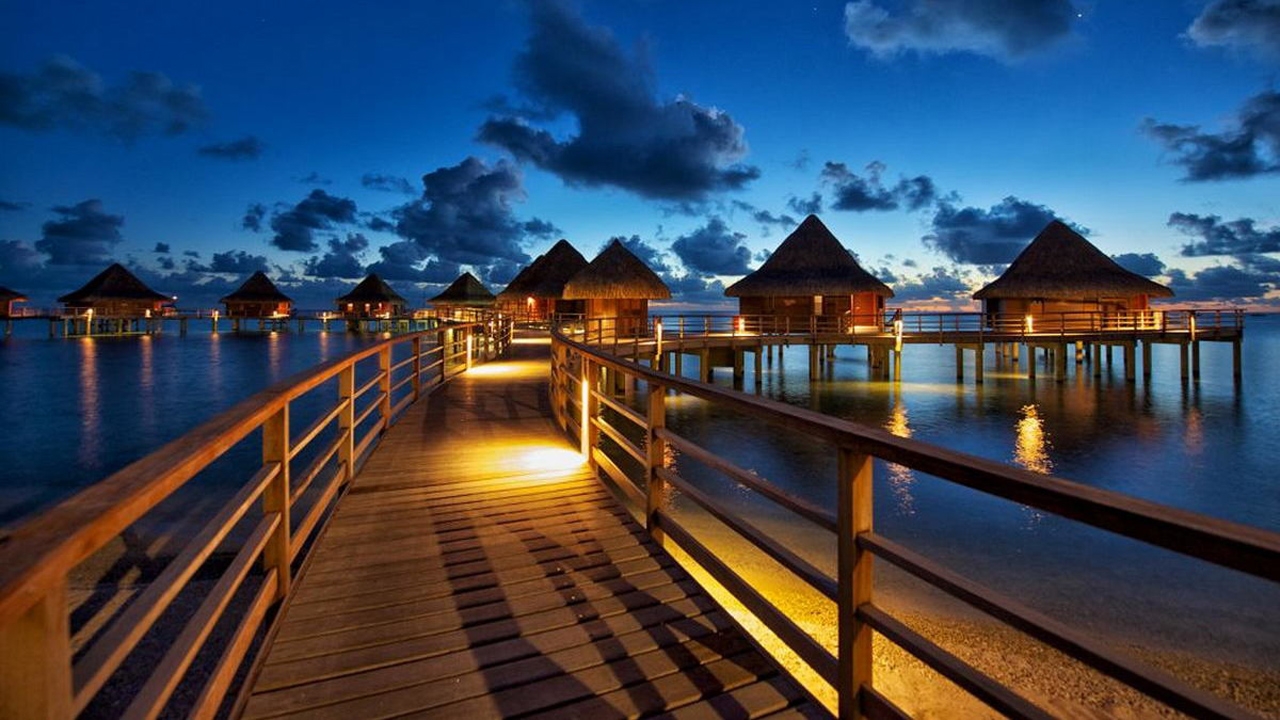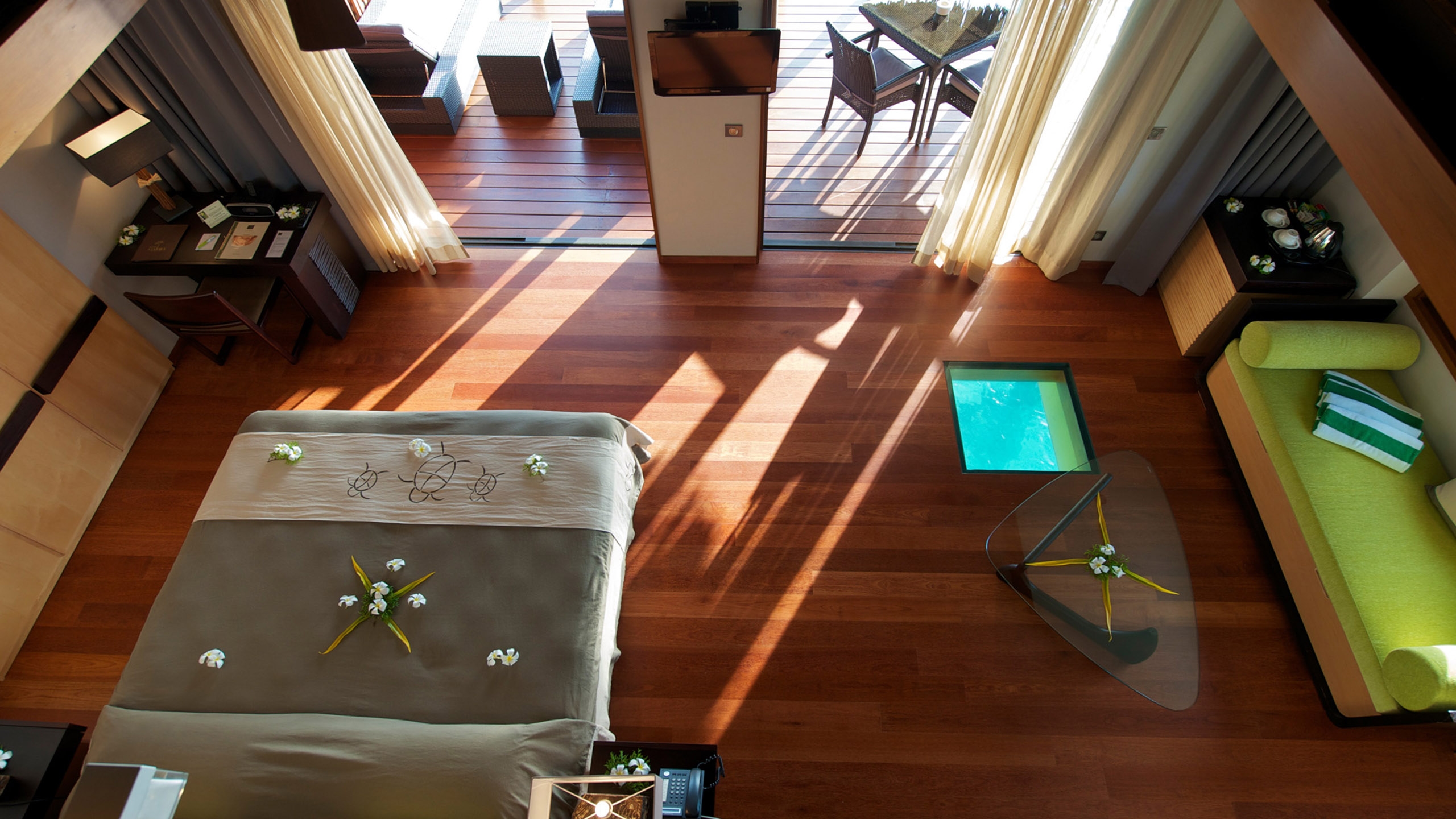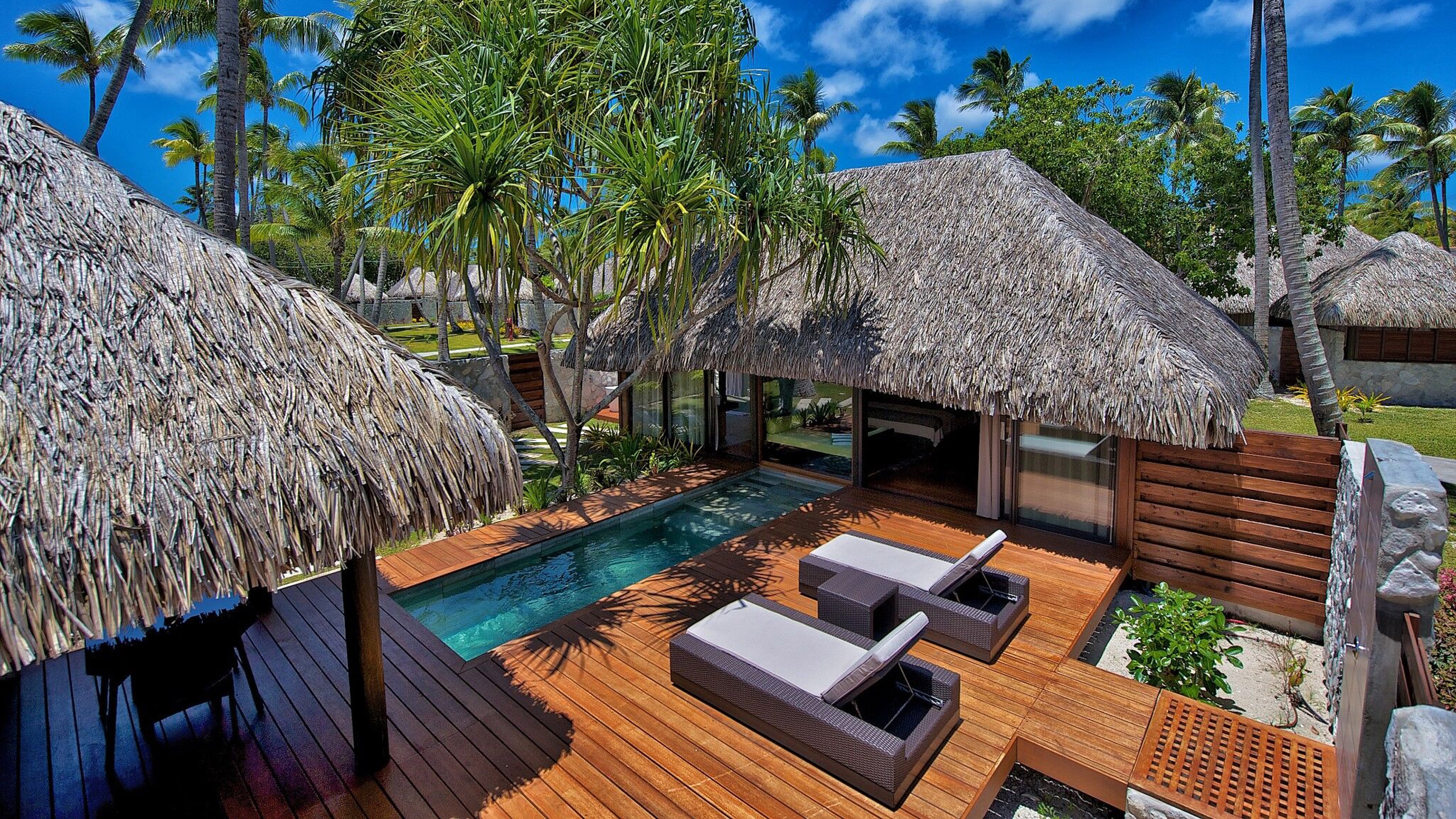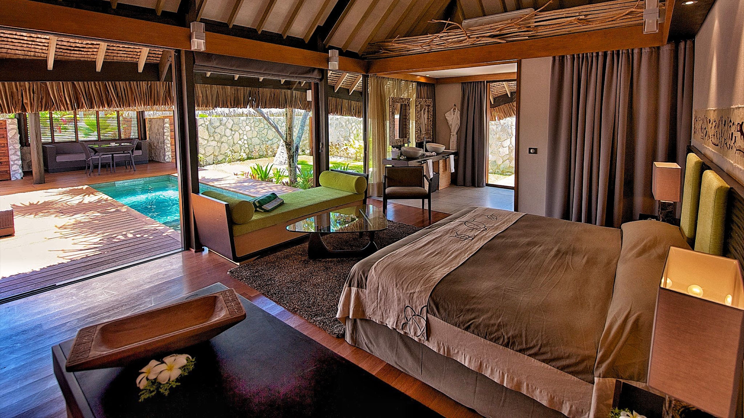 The 60 villas and bungalows are scattered throughout the coconut grove, on the beach, or suspended over the turquoise lagoon. Garden villas feature an enclosed yard and a private plunge pool, an ideal option for families. The buildings are designed in a traditional Polynesian architectural style, and the views from the resort are impressive as the water glistens in the sunlight.