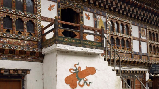 Those of a sensitive disposition may find themselves blushing while visiting some of Bhutan’s villages where paintings of phalluses are a common sight on homes and buildings. This tradition dates back to the time of Lama Drukpa Kunley, the Divine Madman, who was known for his unorthodox teaching methods around the 15th century. Tradition has it that the symbols of erect penises help to fend off evil. Recent studies suggest, however, that the phallus may have already been an important part of the early religion that existed in Bhutan.