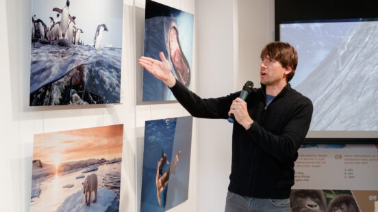 As I look at each one of these images I am reminded of how grateful I am that they have taken me out of my comfort zone, and how each encounter just fuels the addiction to want to do it again. So many of the photos on show at this exhibition were taken on an actual expedition. A lot of the images here required a ridiculous amount of sweat equity. There was a lot of discomfort involved to take most of these shots. In order to capture the image of the colony of fledgeling Adélie penguins heading out to sea, I had to lie in the water for over 30 minutes wearing a dry suit. I had to move as little as possible because the penguins won’t jump into the water in front of you, so I had to wait for quite a while!