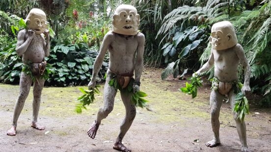 These are the Asaro Mudmen. The story goes that they had been defeated by their enemy and their lands had been taken so they waited until dusk and when the enemy saw them rising up from the banks of the river covered in mud they thought they were spirits and fled.