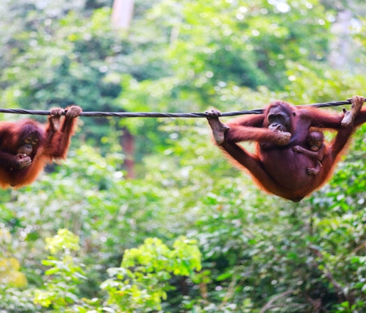 Two orangutang clinging to a vine, one has a baby holding on to its back. They are in front of a rainforest canopy.